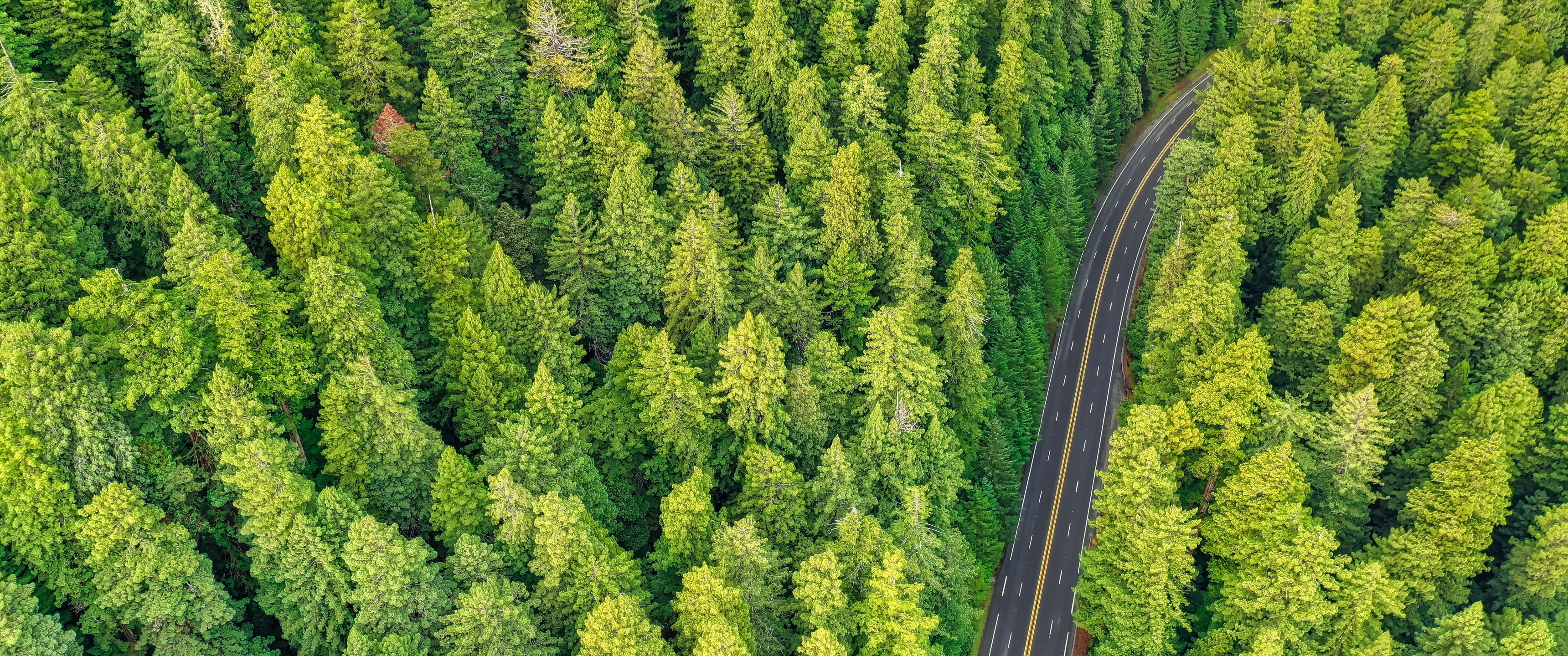 Beautiful Green Fir Forest and Road Aerial View - 3440x1440 Ultra WQHD