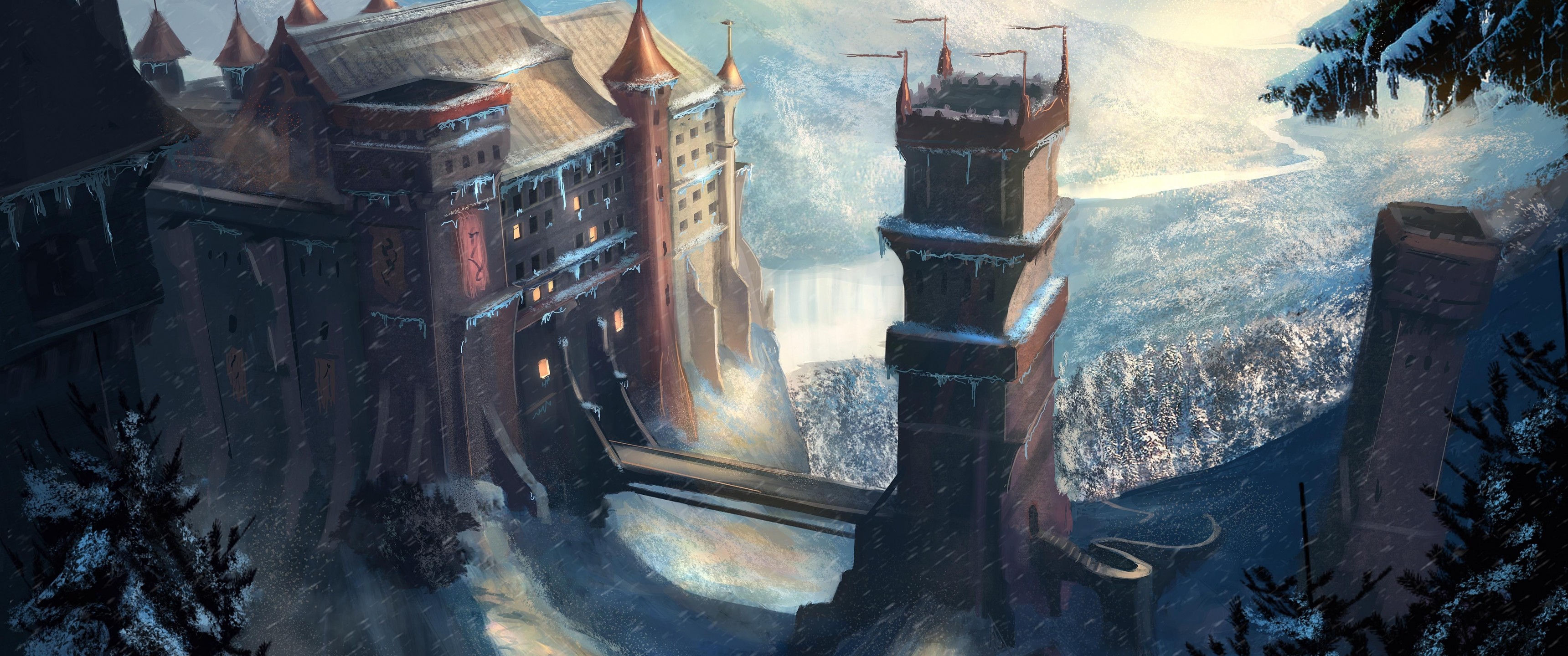 Beautiful old castle in mountain valley and winter - 3440x1440 Ultra WQHD