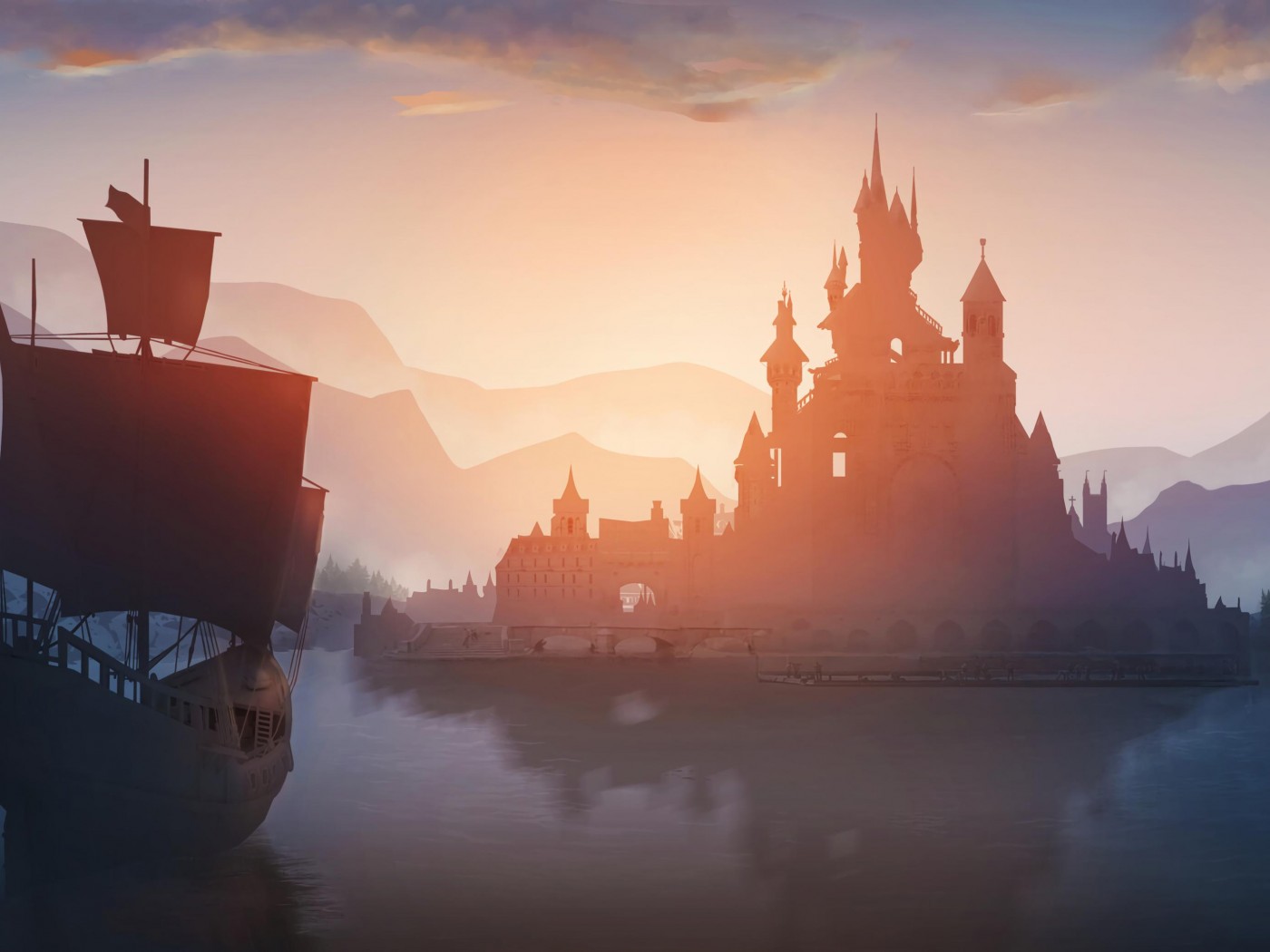 Ship and Castle in Port - 1400x1050