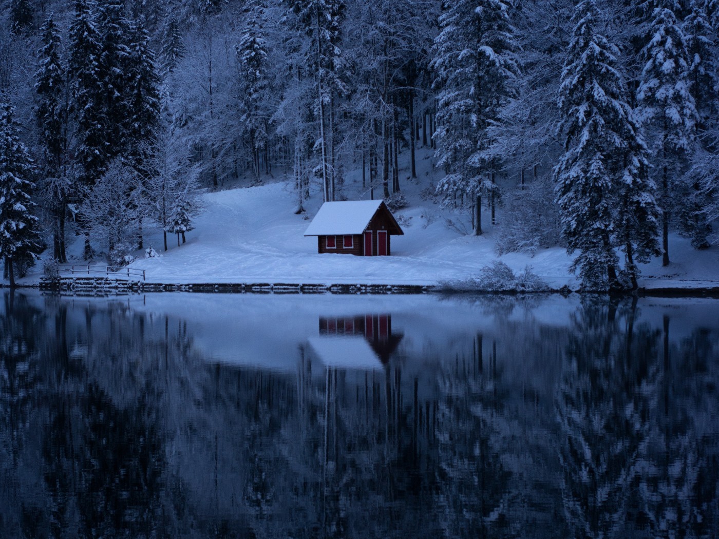 Snow Covered Fir Forest and Single House on Shore of Lake - 1400x1050