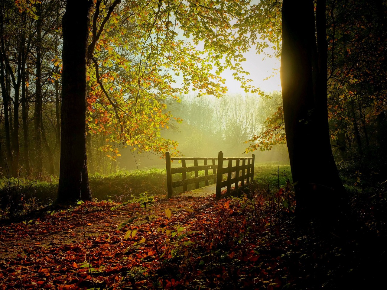 Autumn Dark Forest with Morning Sunlight and Old Wood Bridge - 1280x960