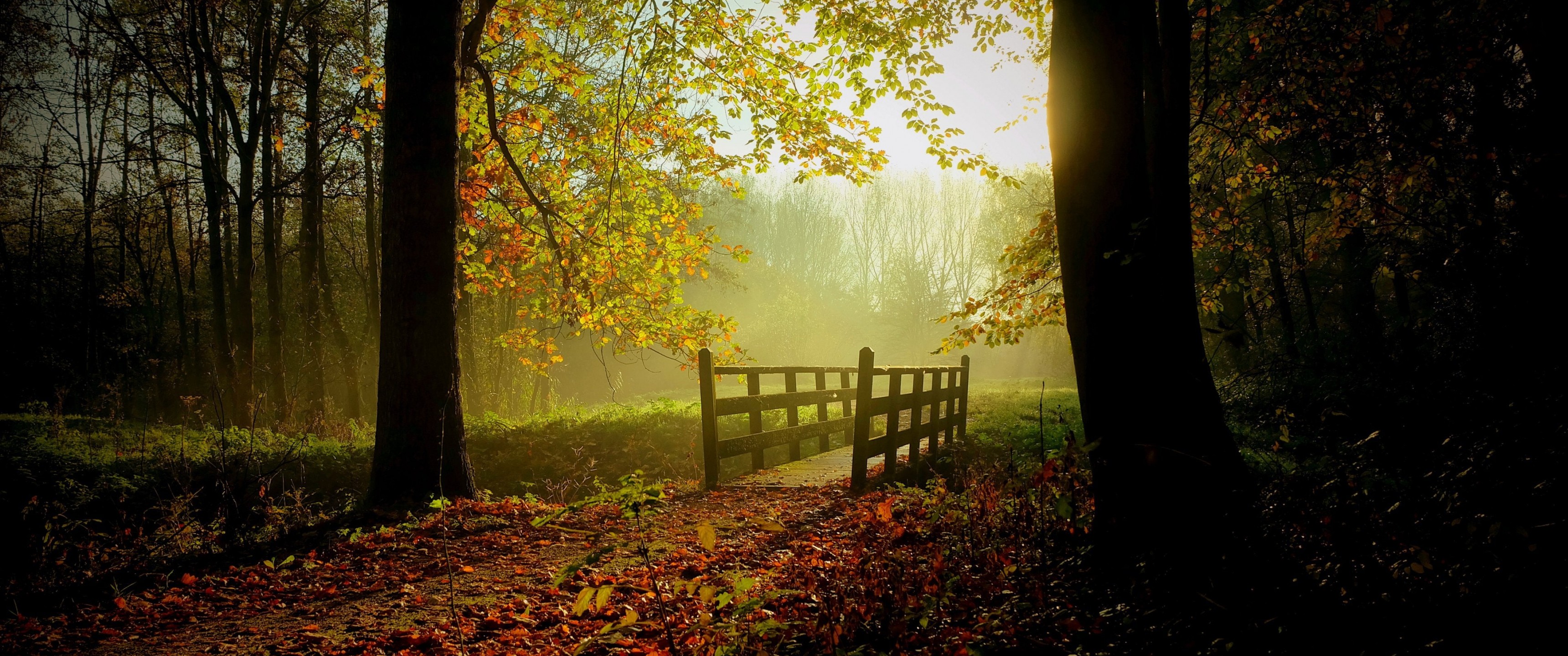 Autumn Dark Forest with Morning Sunlight and Old Wood Bridge - 3440x1440 Ultra WQHD