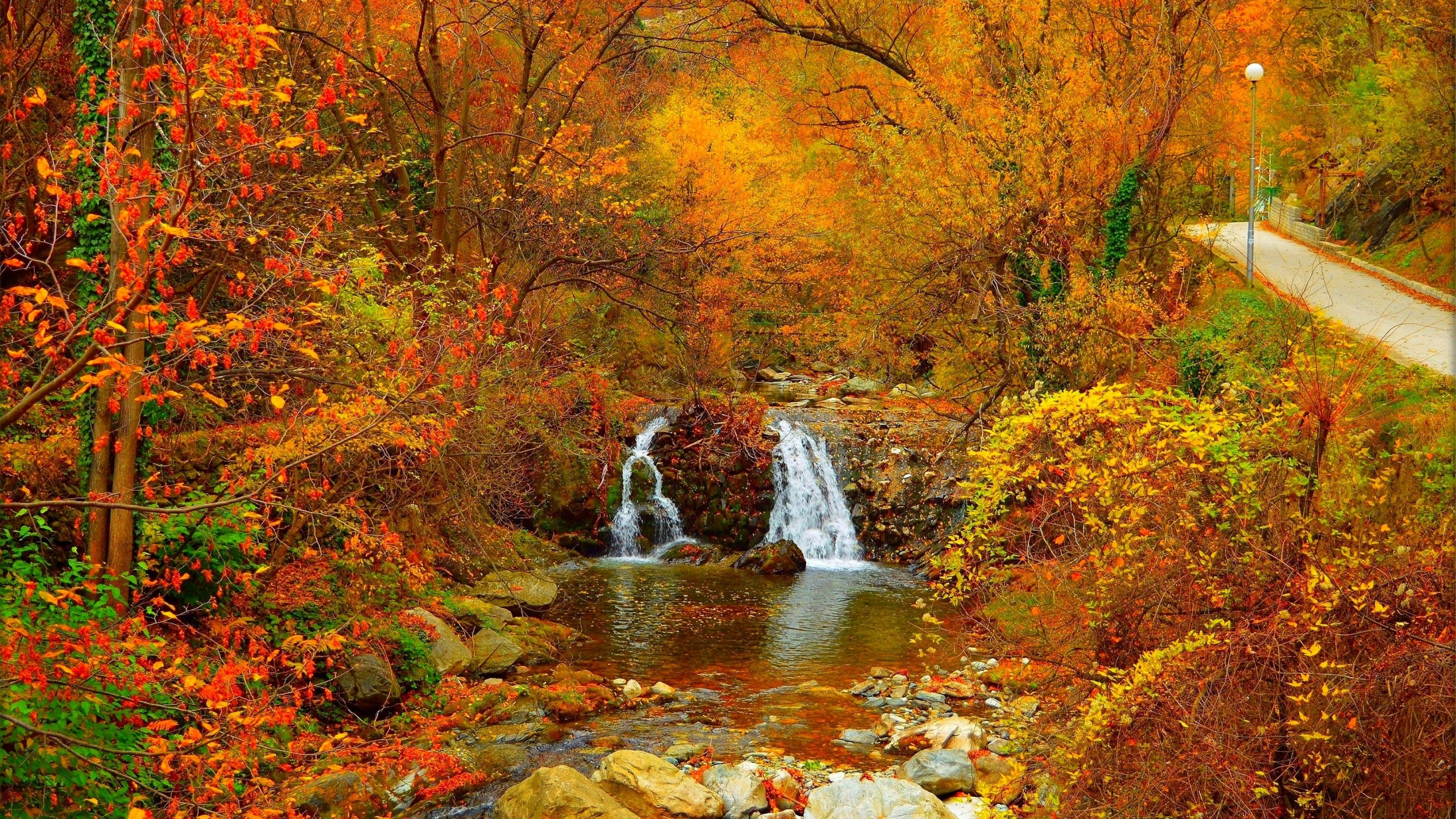 Beautiful Autumn Forest and Waterfall among The Trees - 2560x1440