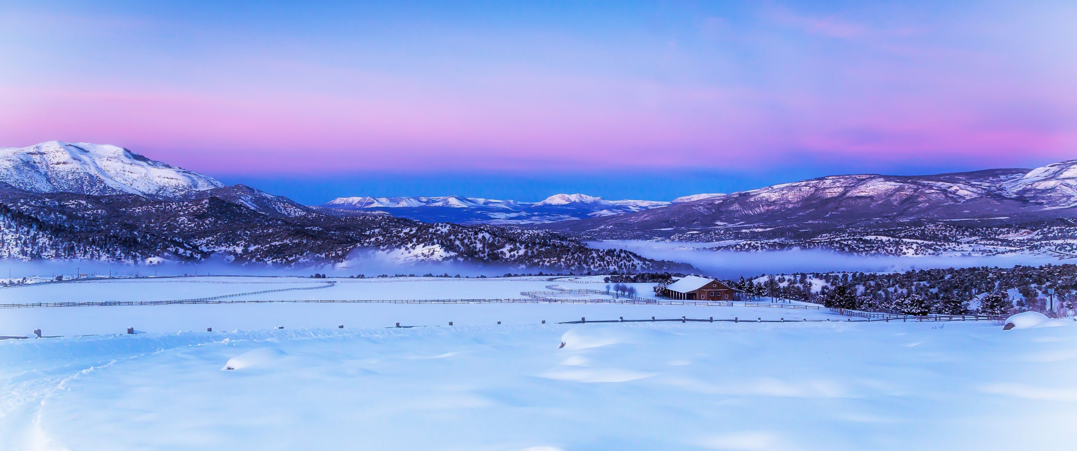 Beautiful Big Field Single House and Amazing Snowed Valley - 3440x1440 Ultra WQHD