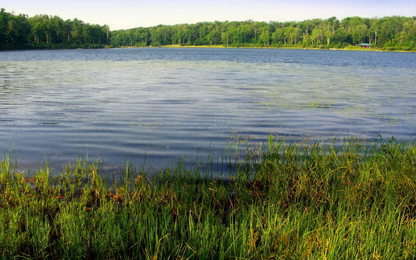Beautiful Green Grass and Forest with Lake - 1440x900