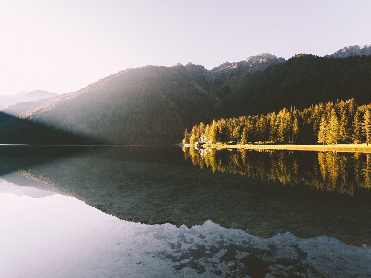 Beautiful Lake in Mountain Valley and Single House on Shore - 1280x960