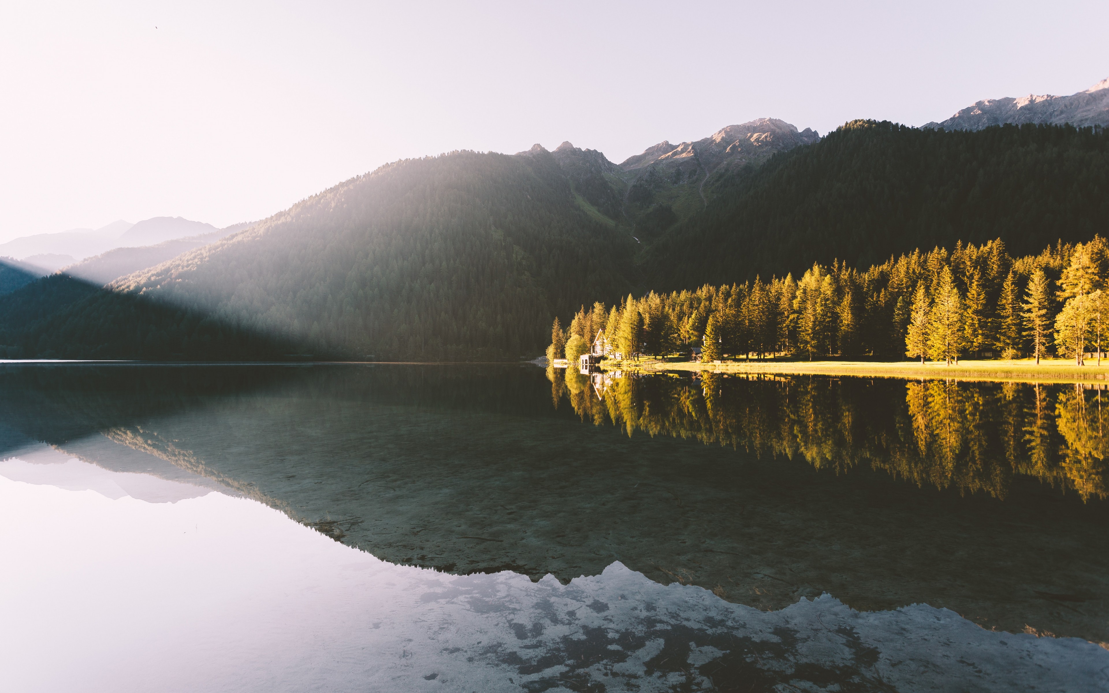 Beautiful Lake in Mountain Valley and Single House on Shore - 3840x2400