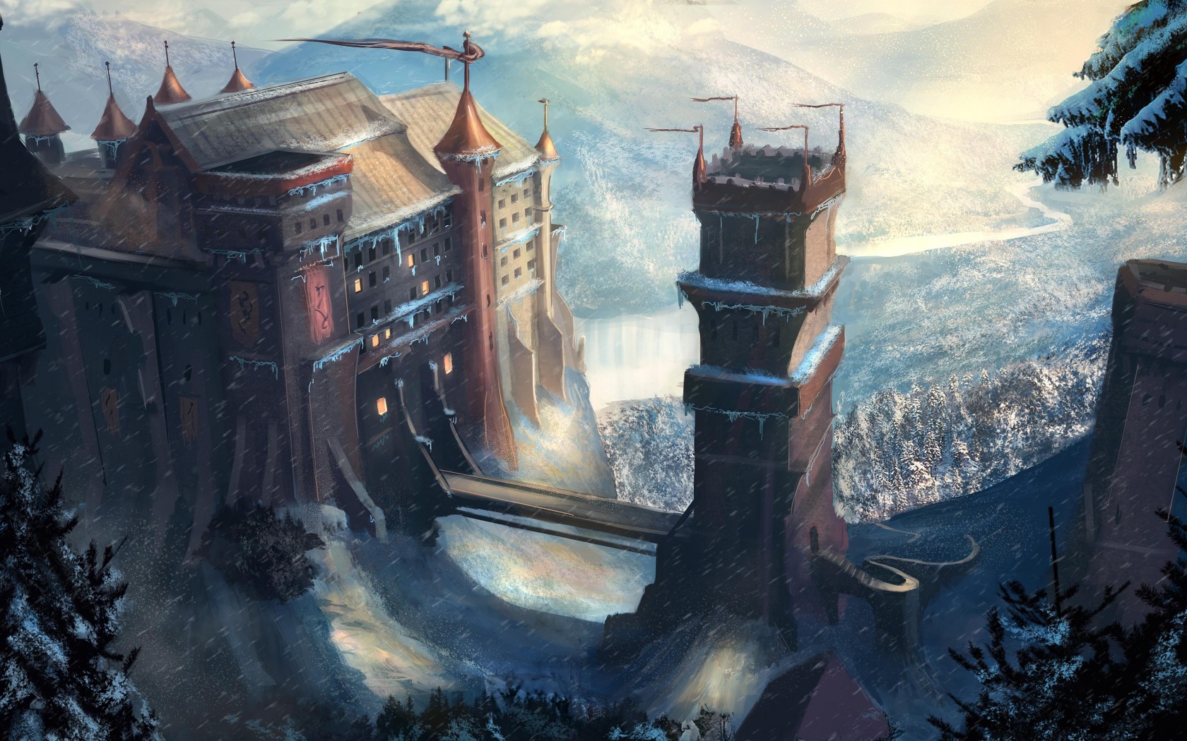Beautiful old castle in mountain valley and winter - 1680x1050