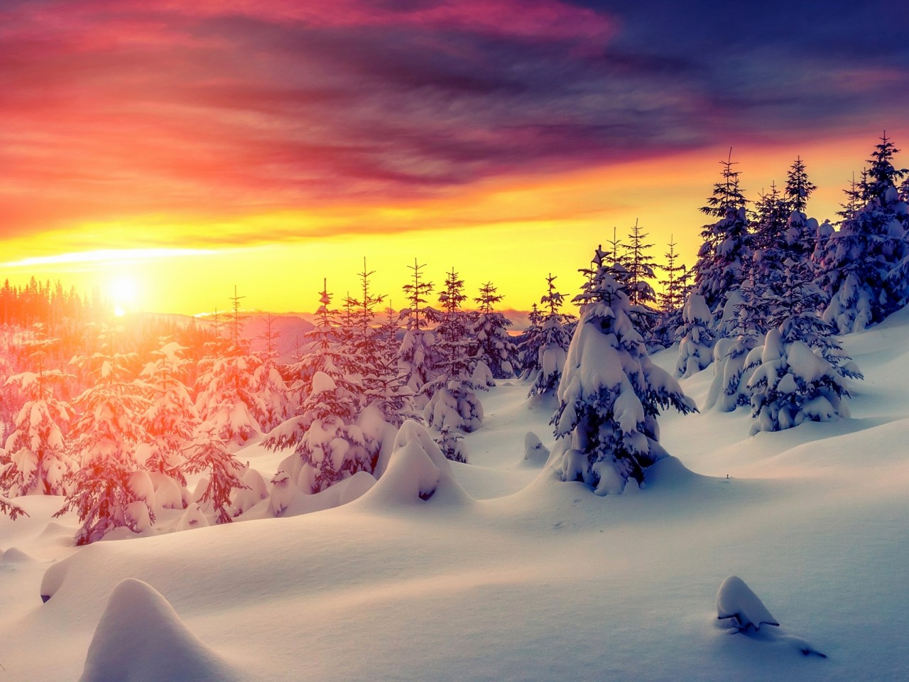 Beautiful Orange Sunset in Snowy Pine Forest - 1280x960