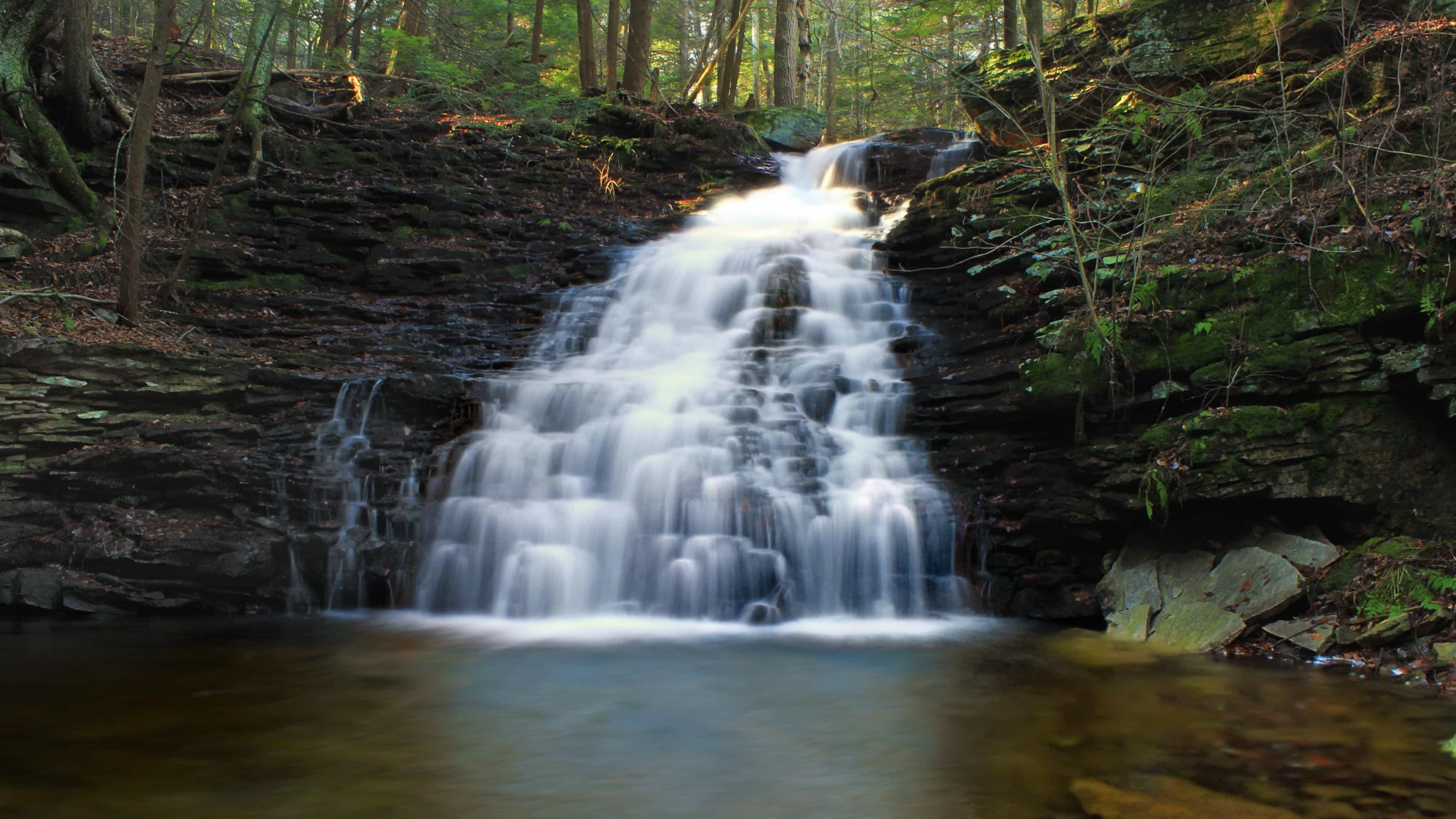 Beautiful pure waterfall and river in green forest - 2560x1440