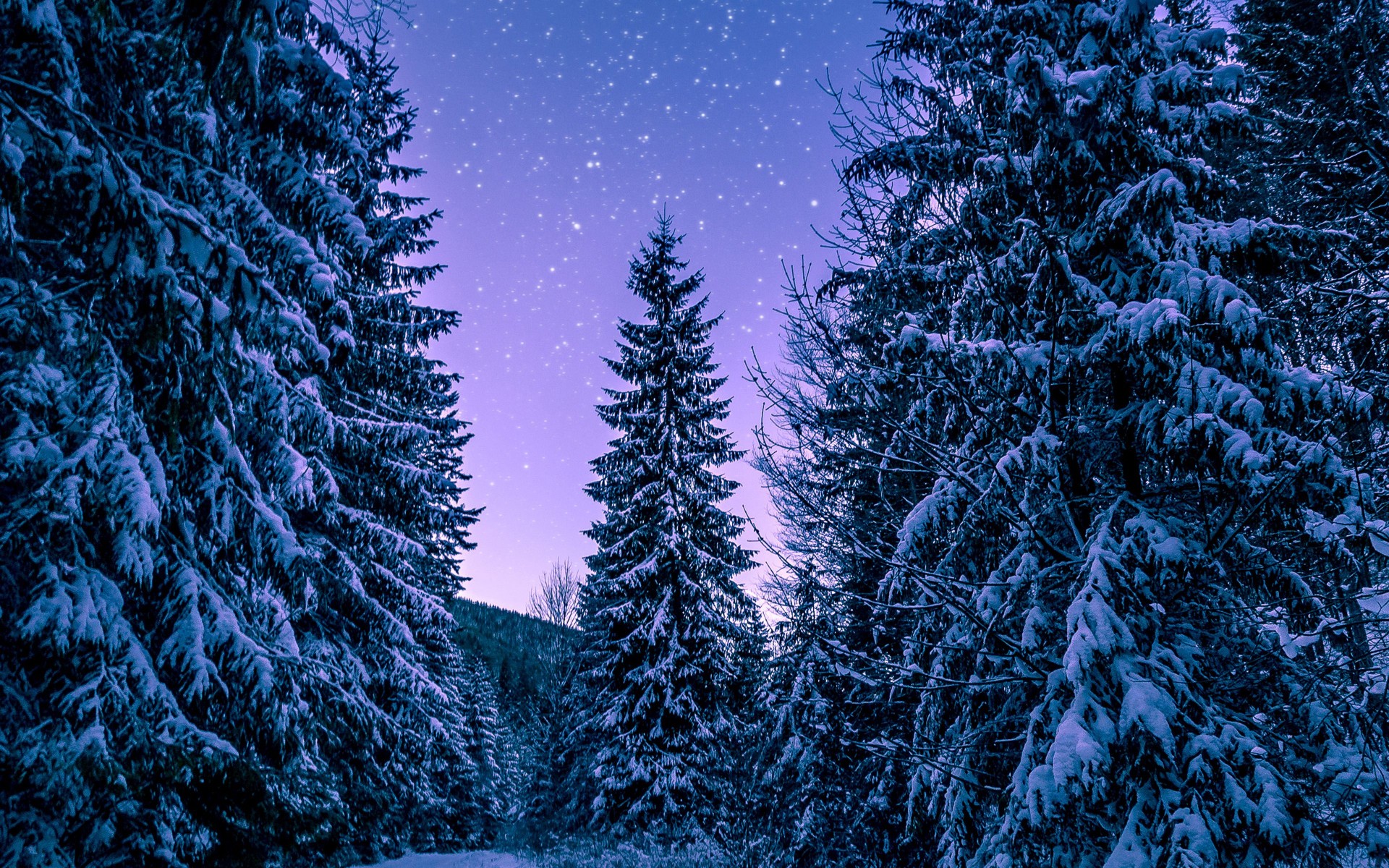 Beautiful Purple Sunset in snowy Pine Forest - 1920x1200