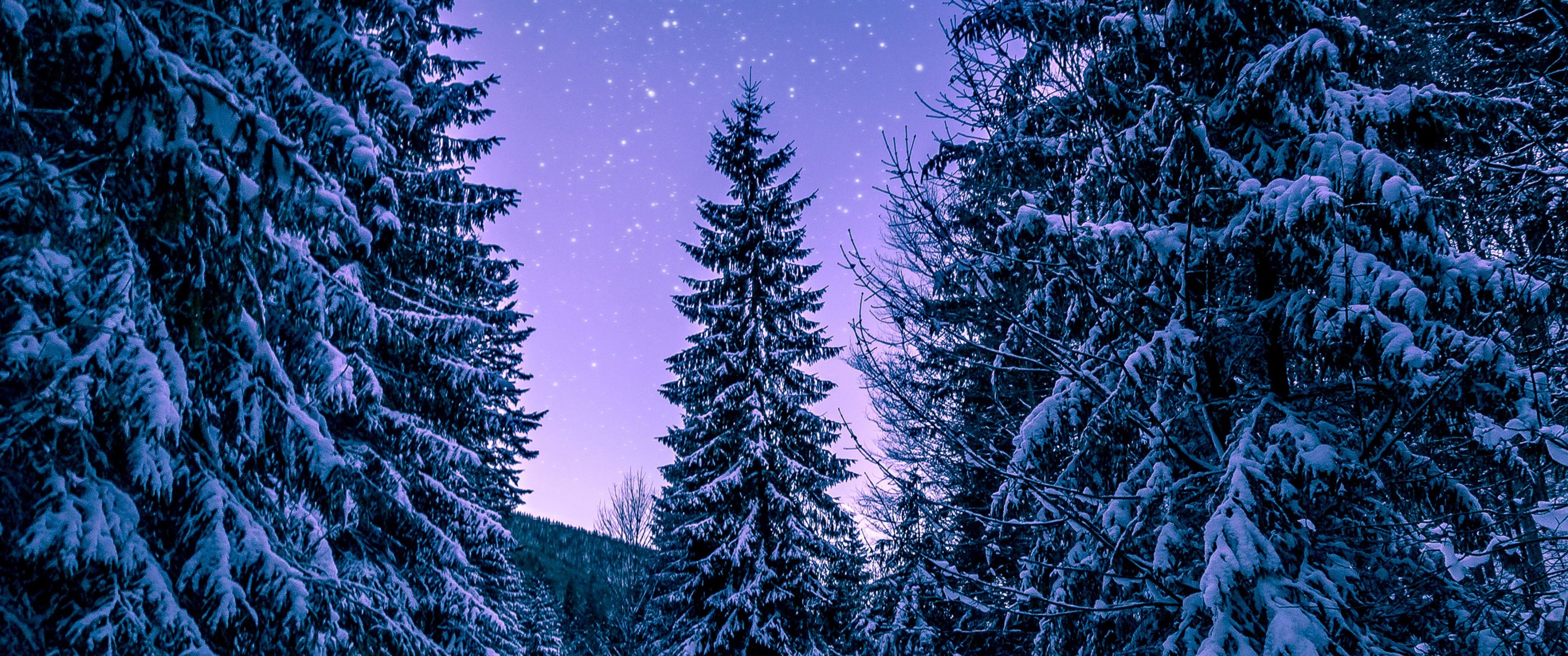 Beautiful Purple Sunset in snowy Pine Forest - 3440x1440 Ultra WQHD