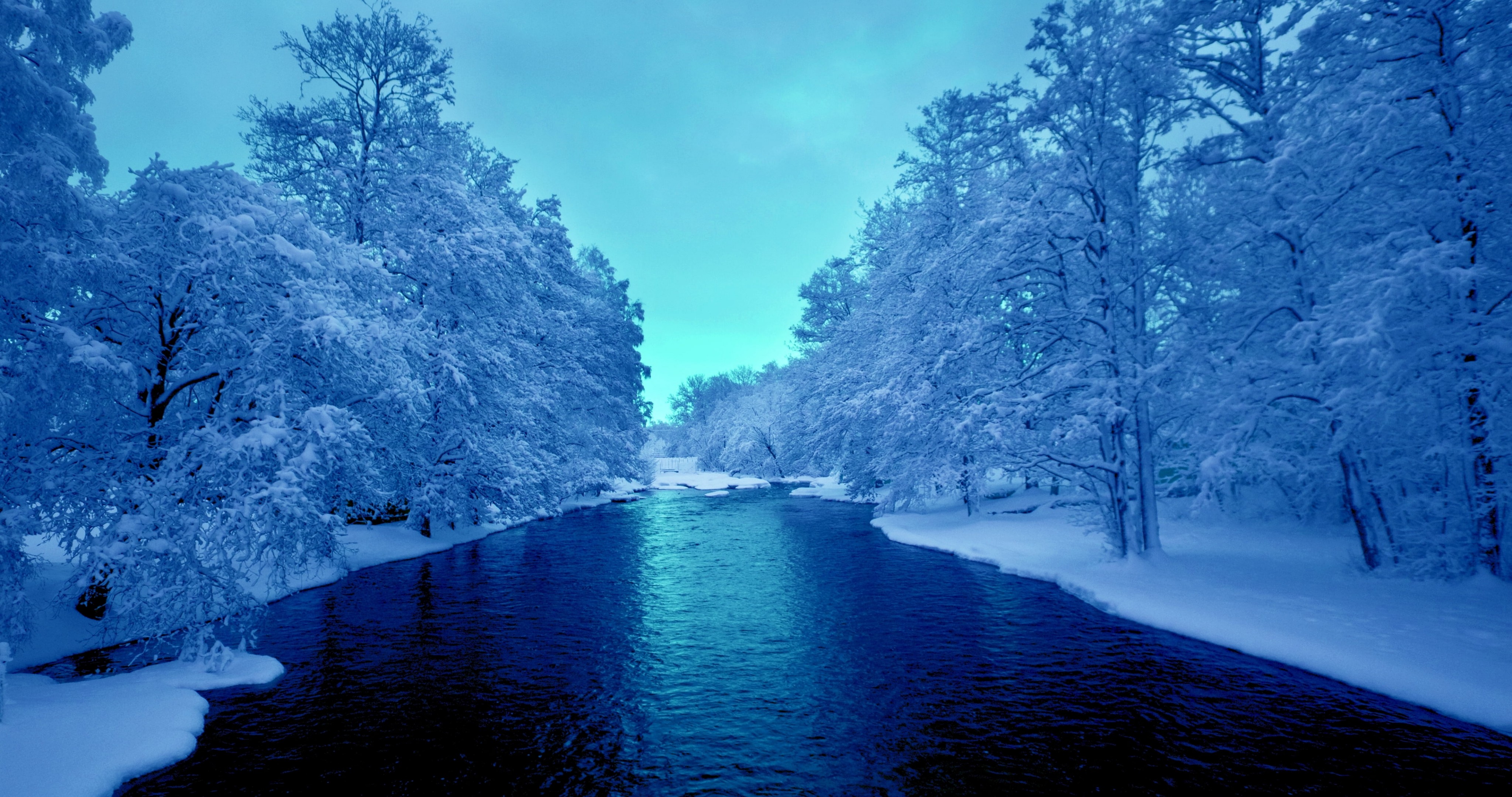 Beautiful River in Winter Forest and Sunset - 4096x2160 4K
