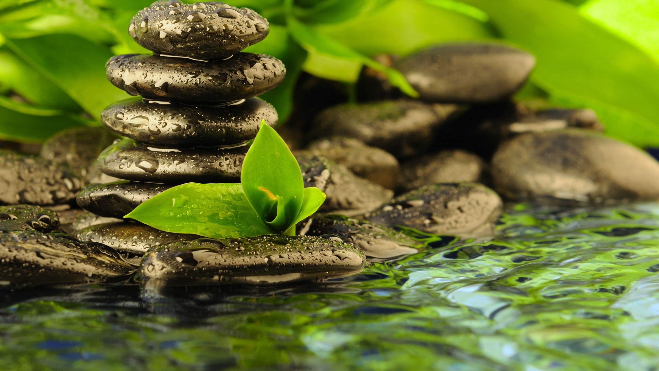 Beautiful Rocks Green Leaves and Water - 2560x1440