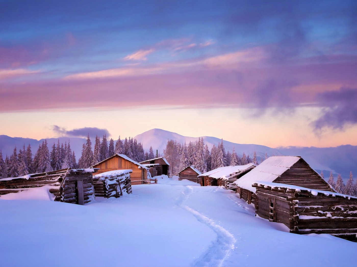 Beautiful Snowed Village and Purple Sunset - 1400x1050