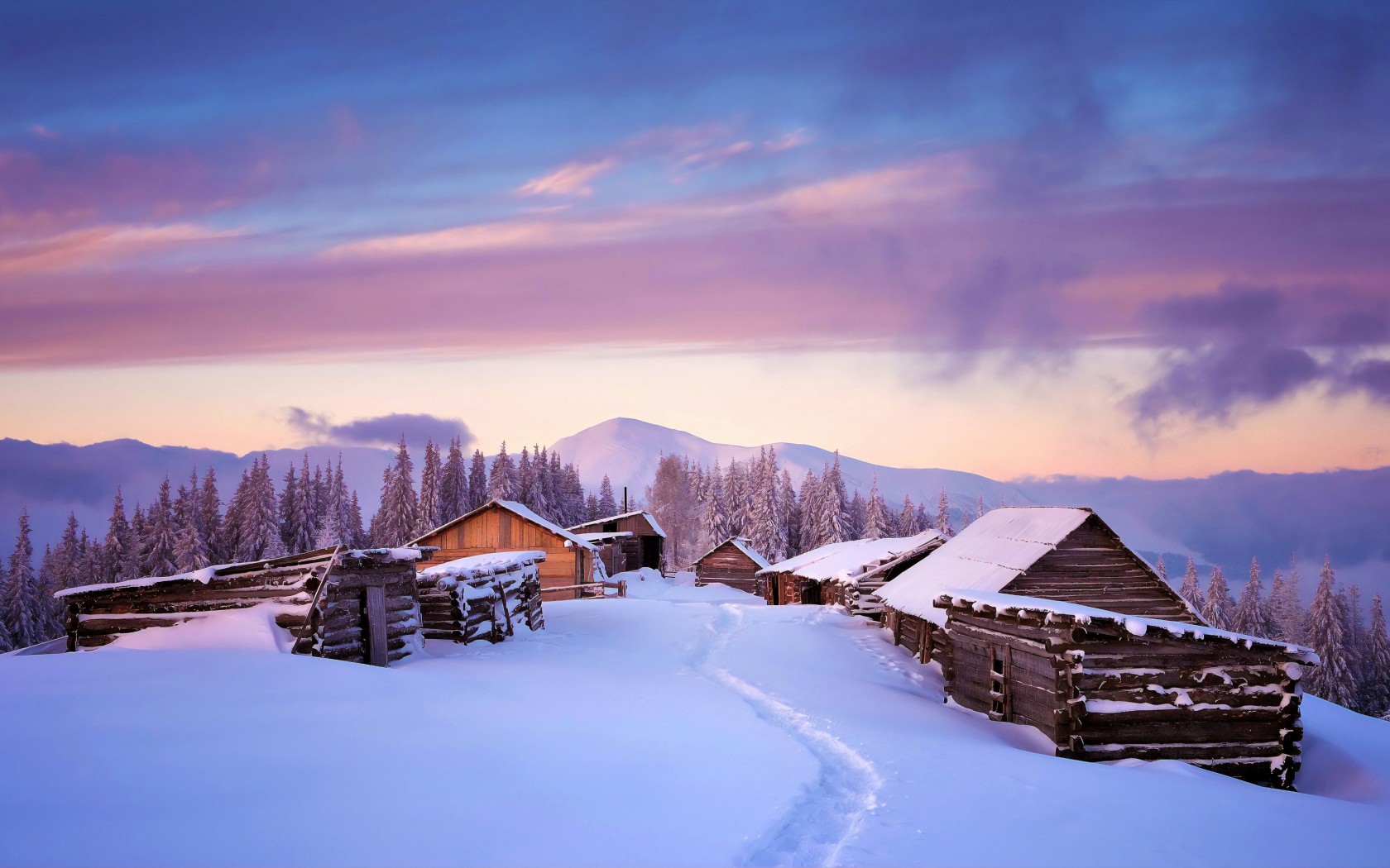 Beautiful Snowed Village and Purple Sunset - 1680x1050