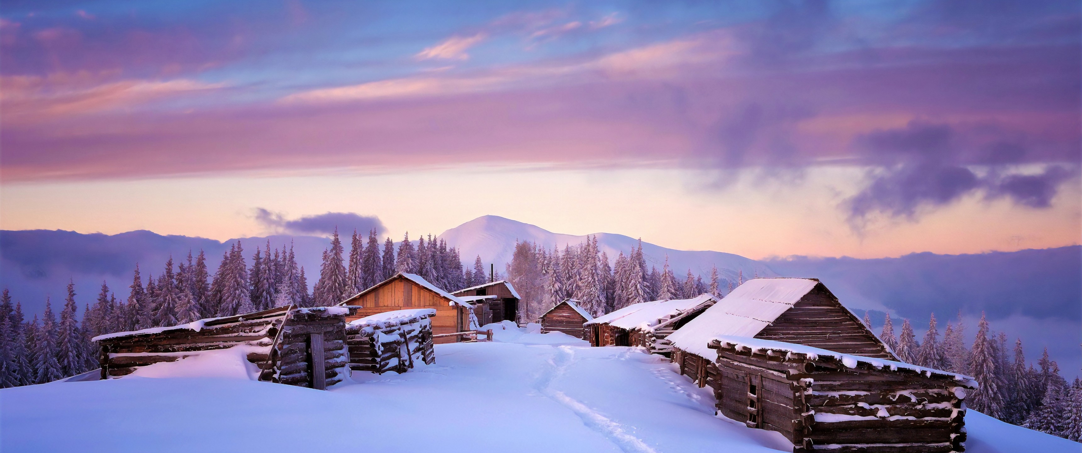 Beautiful Snowed Village and Purple Sunset - 3440x1440 Ultra WQHD