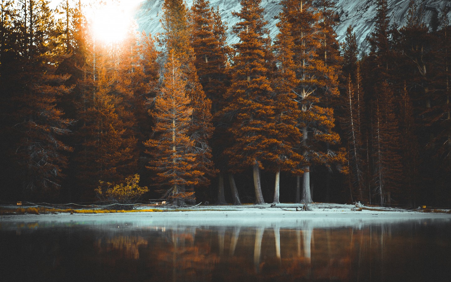 Beautiful Sunbeam and Fir Trees on Shore - 1440x900