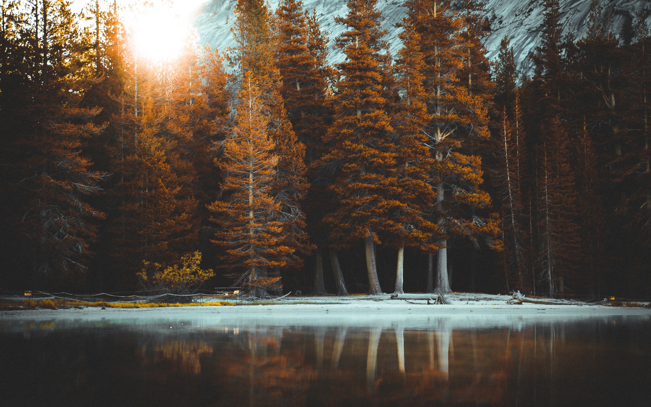 Beautiful Sunbeam and Fir Trees on Shore - 2560x1600