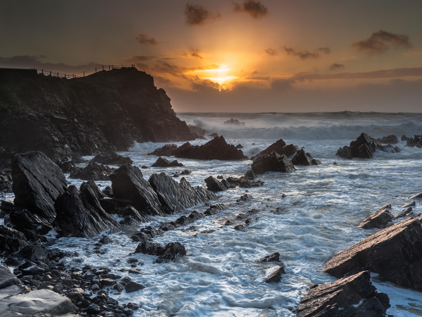 Beautiful Sunset and Waves in Rocks on Coast - 1400x1050