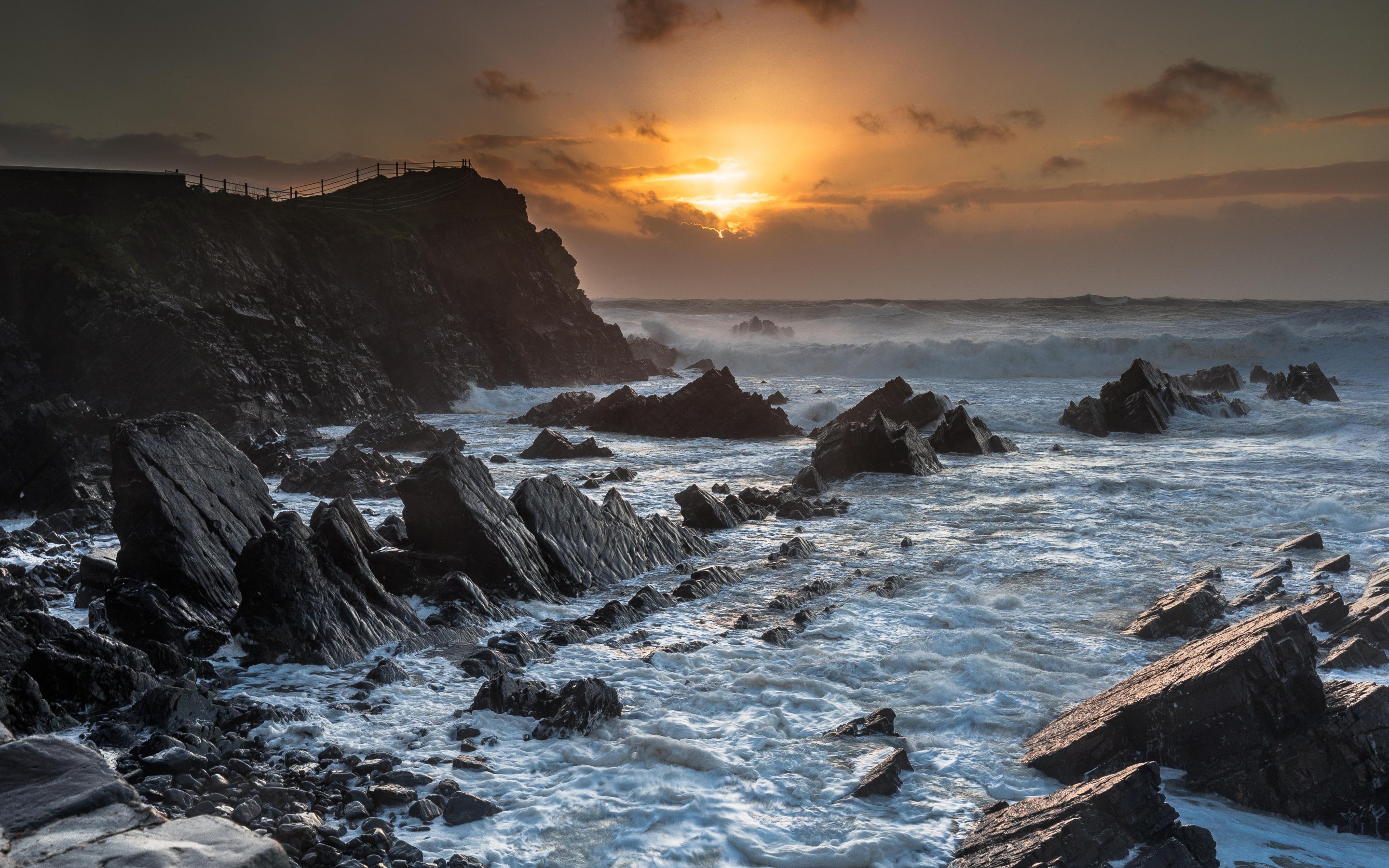Beautiful Sunset and Waves in Rocks on Coast - 2880x1800