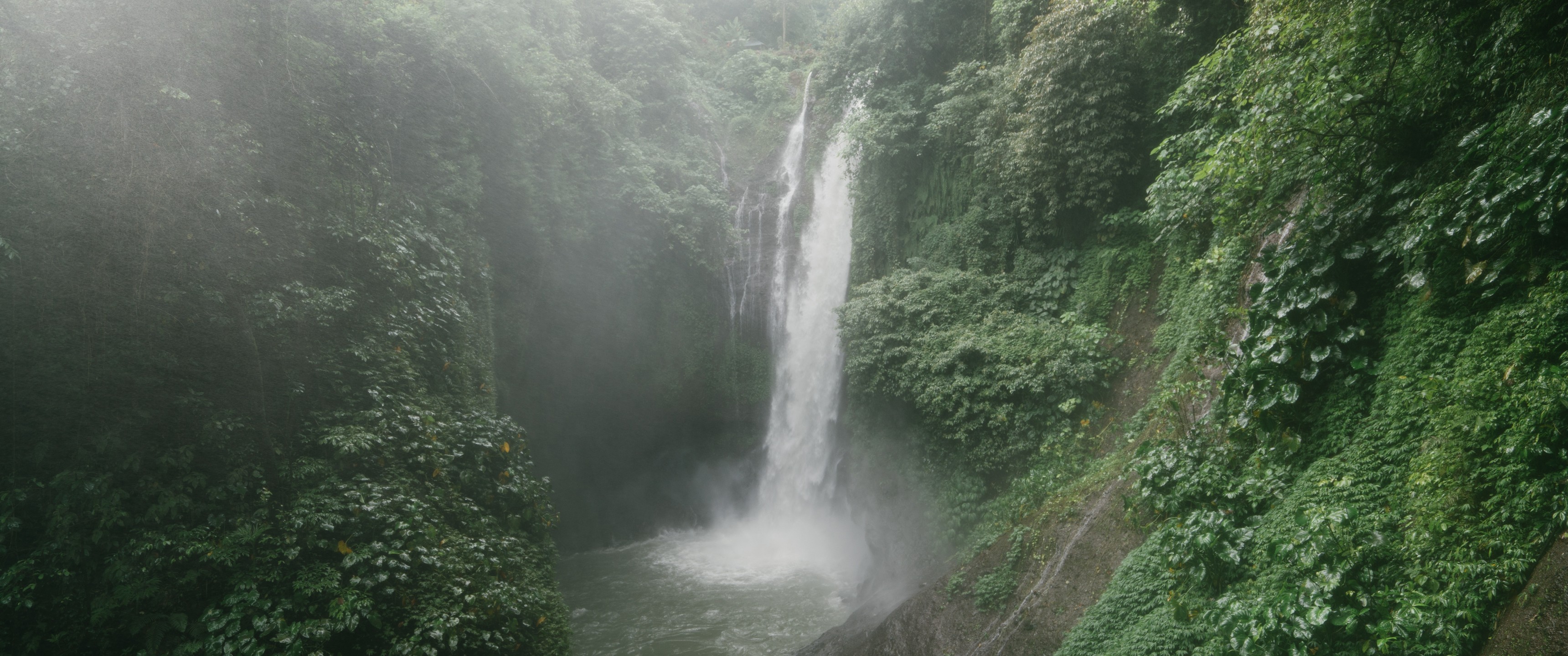Beautiful Waterfall in Green Forest and Fog - 3440x1440 Ultra WQHD