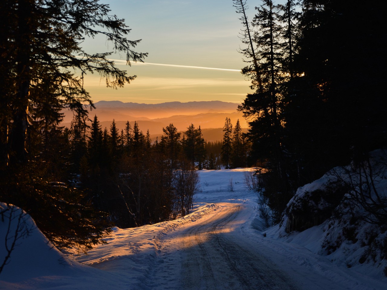 Beautiful Winter Forest Road and Sunset - 1280x960