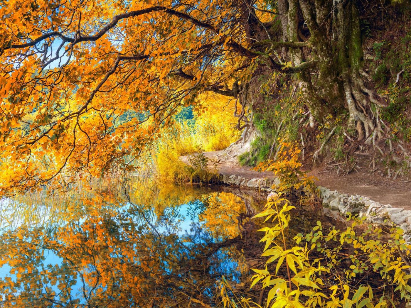 Beautiful Yellow Tree and Reflection on Lake - 1400x1050