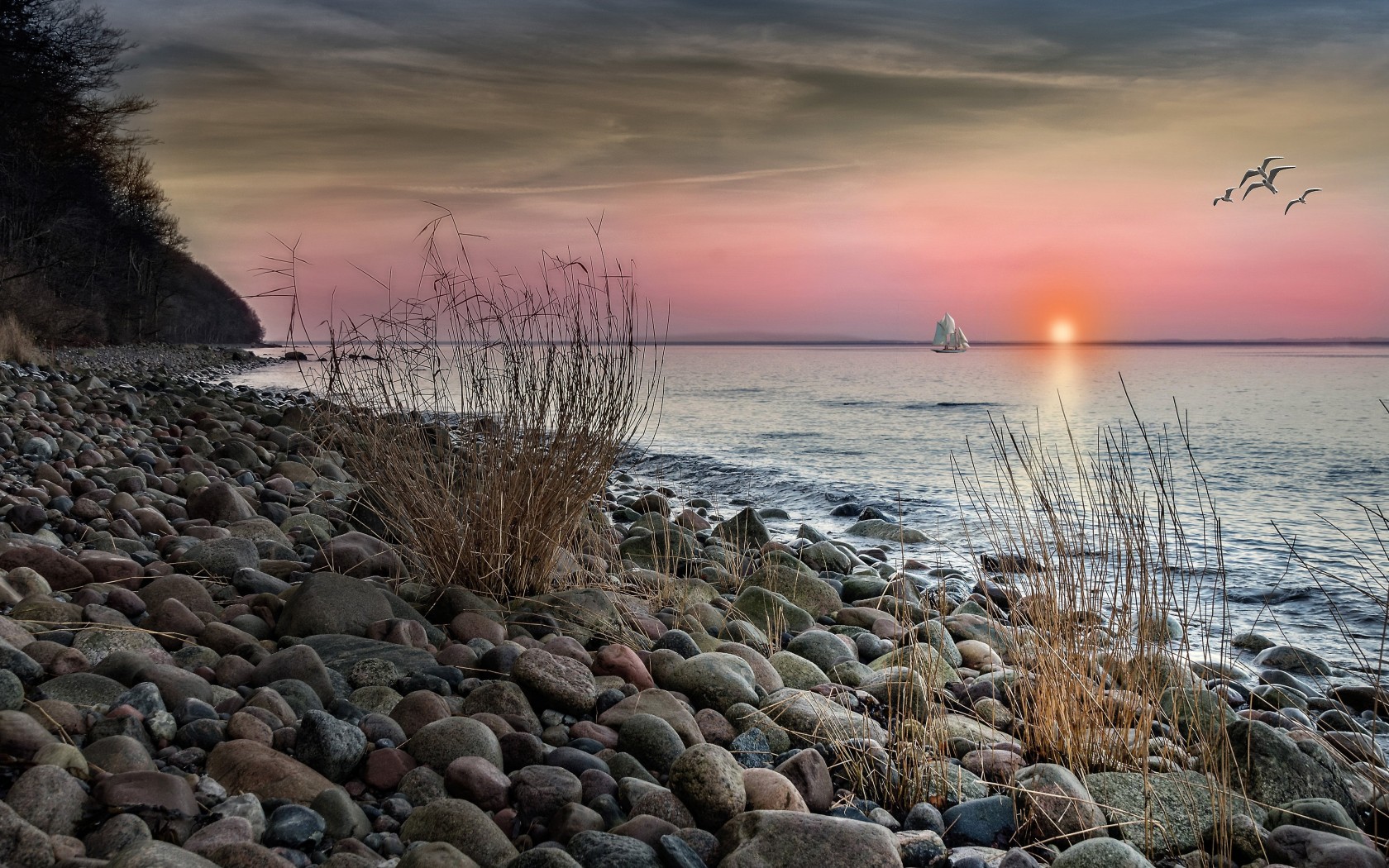 Brown and Grey Stones on Seashore During Sunset - 1680x1050