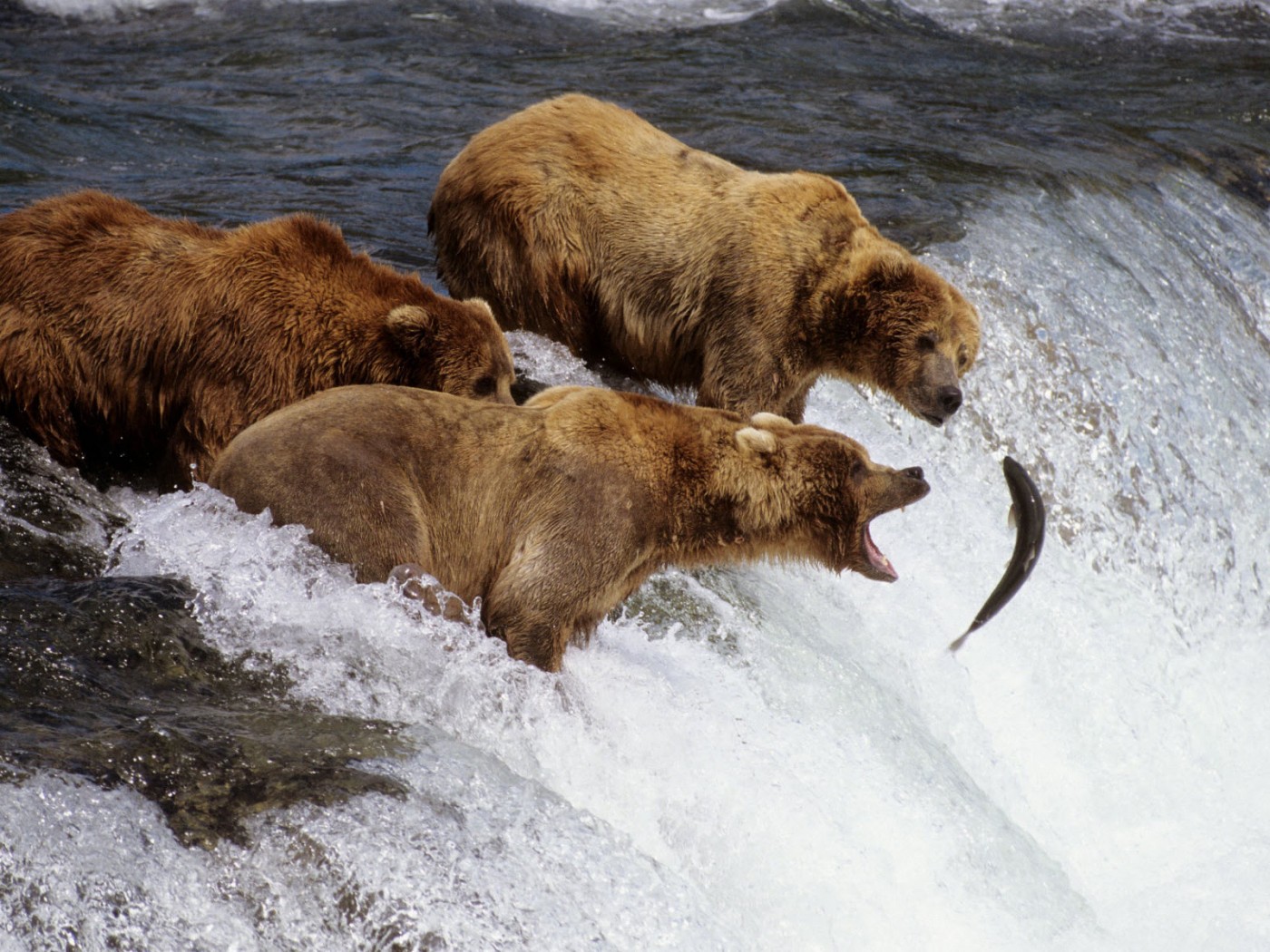 Brown Bears in Alaska Salmon and Waterfall - 1400x1050
