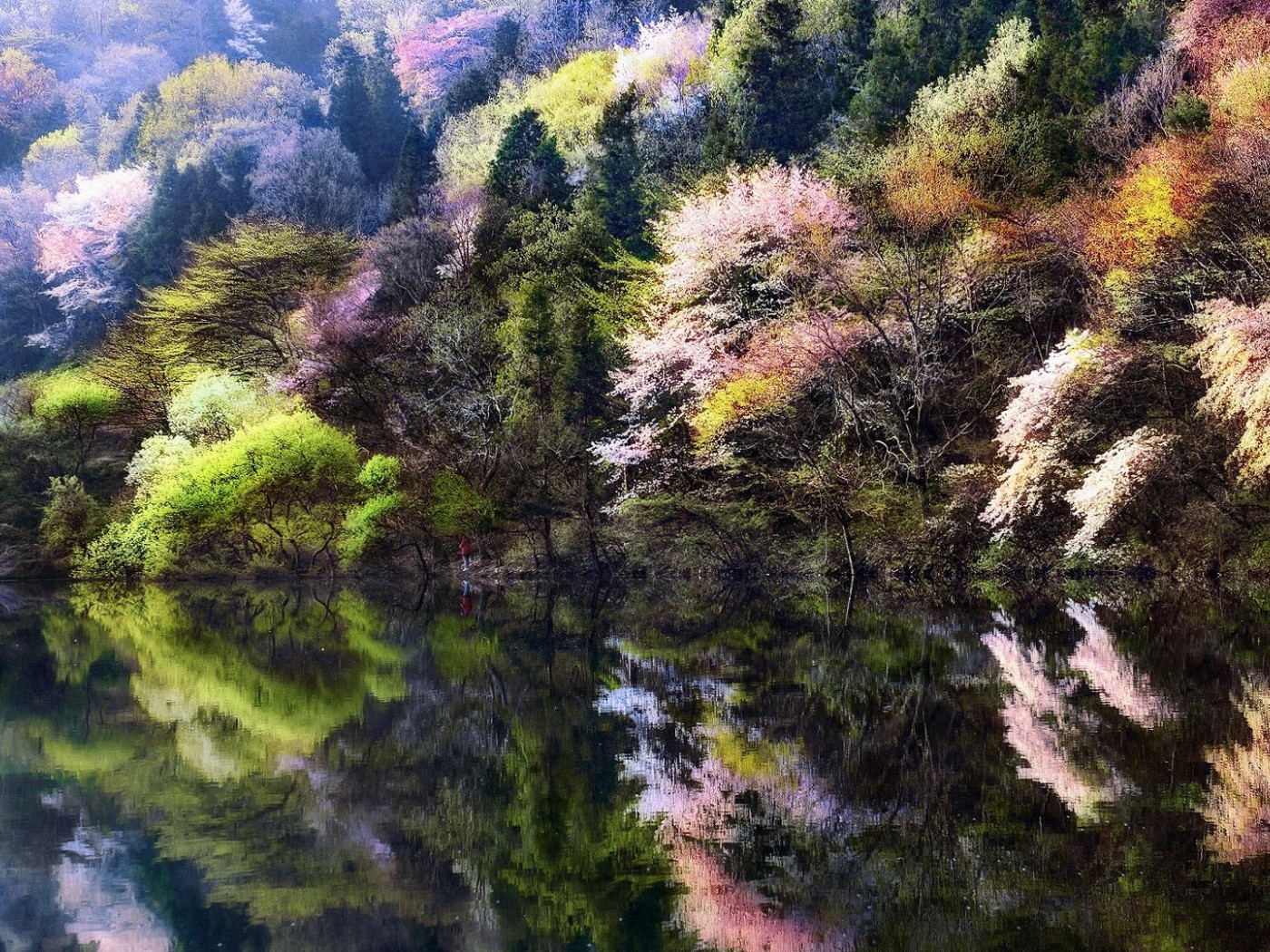 Colorful Autumn Forest and Reflection on River - 1400x1050