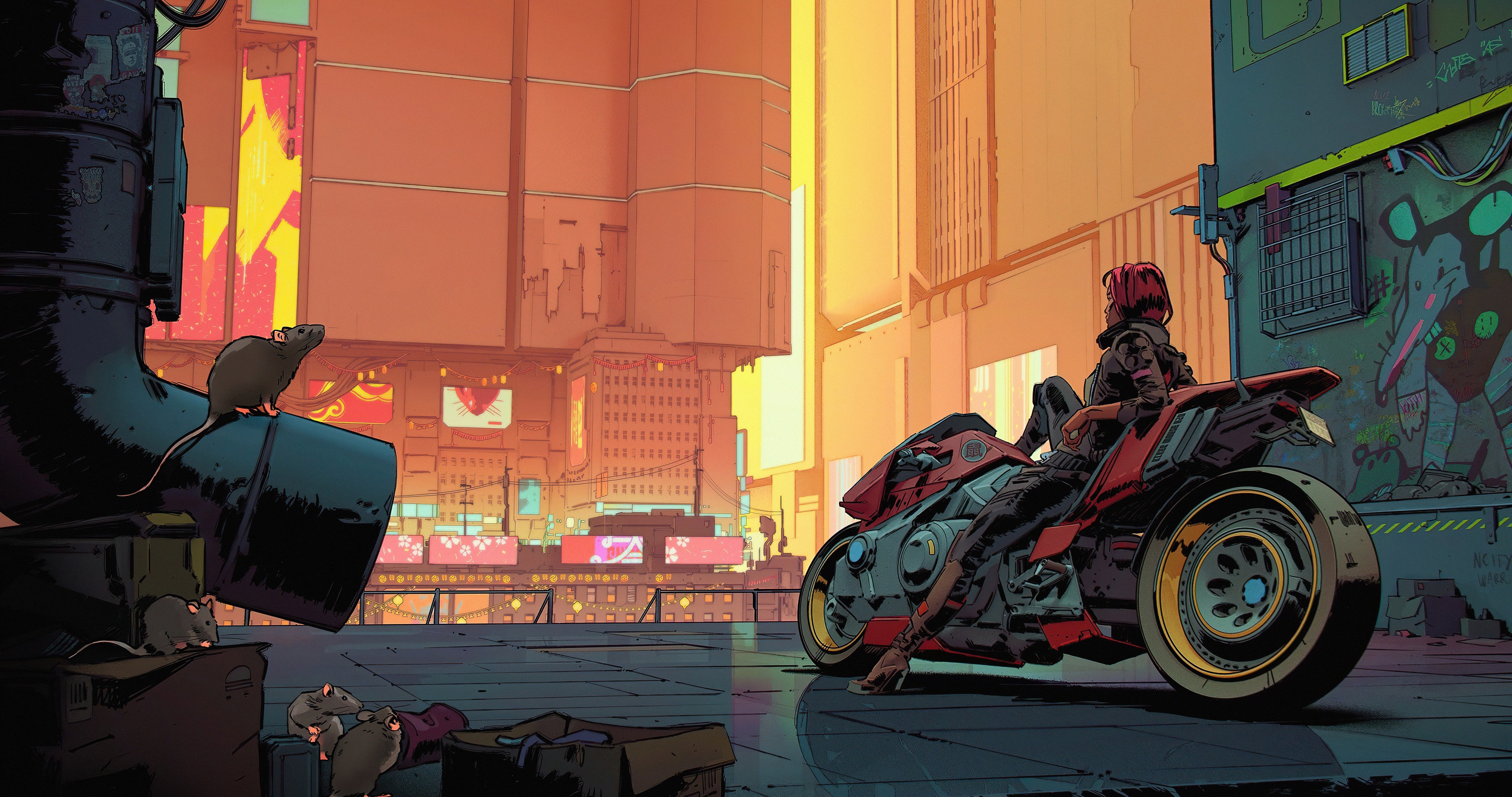 Cyberpunk 2077 Rats on the Street and Girl on Motorcycle - 4096x2160 4K