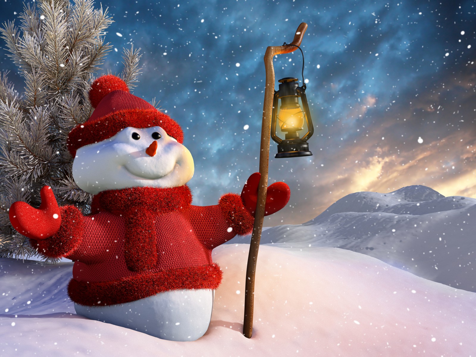 Funny Snowman in Winter Forest Happy New Year and Merry Christmas - 1600x1200
