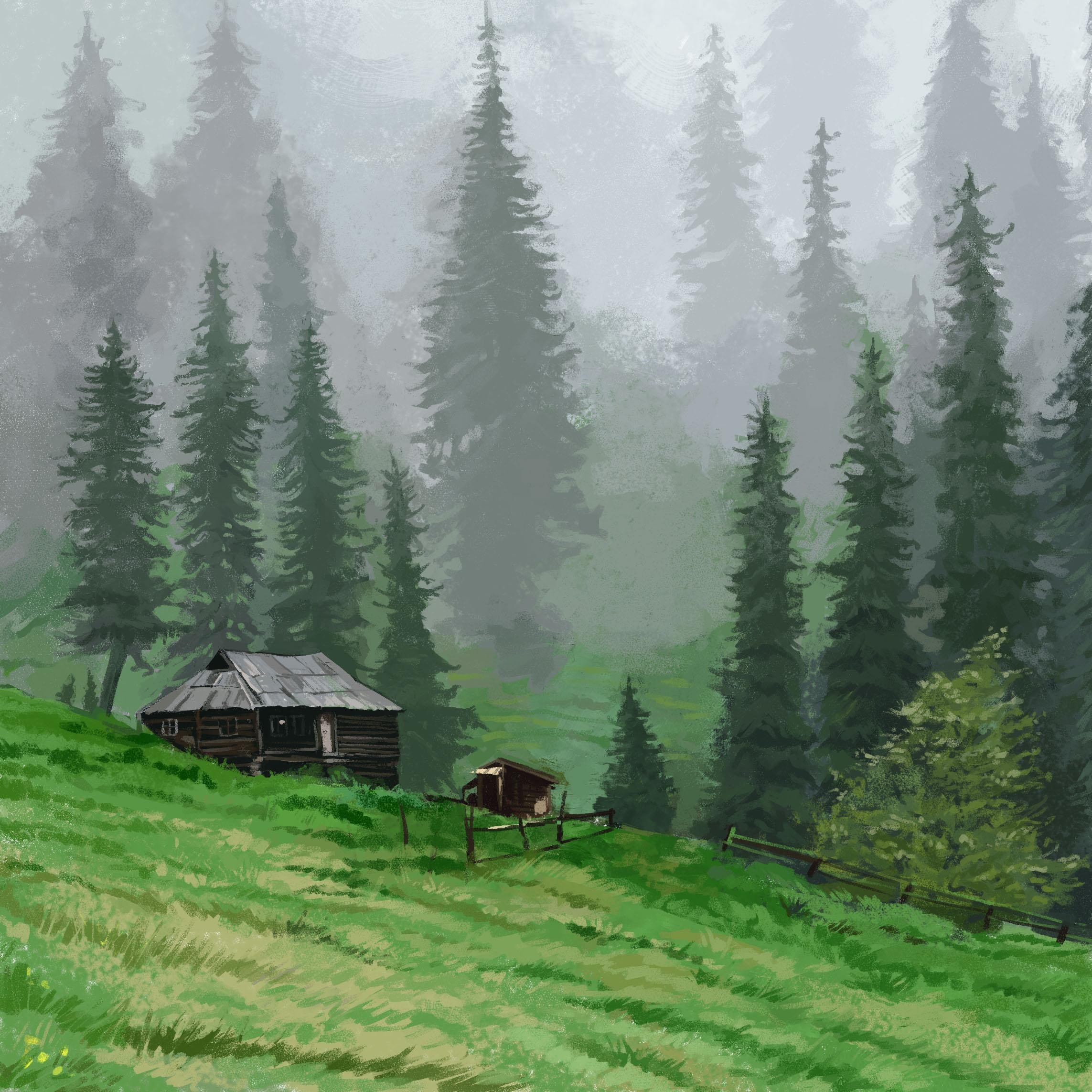 House in Pine Forest and Clouds of Fog - 2286x2285