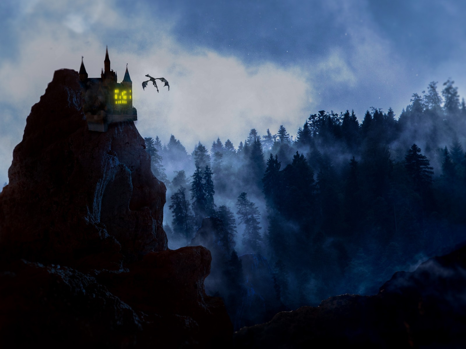 Light in Castle on Hill and Dark Forest - 1600x1200