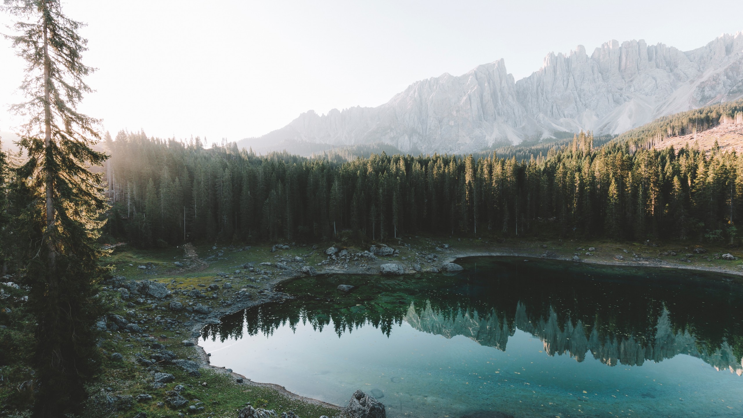Old Fir Forest and Reflection on Lake - 2560x1440