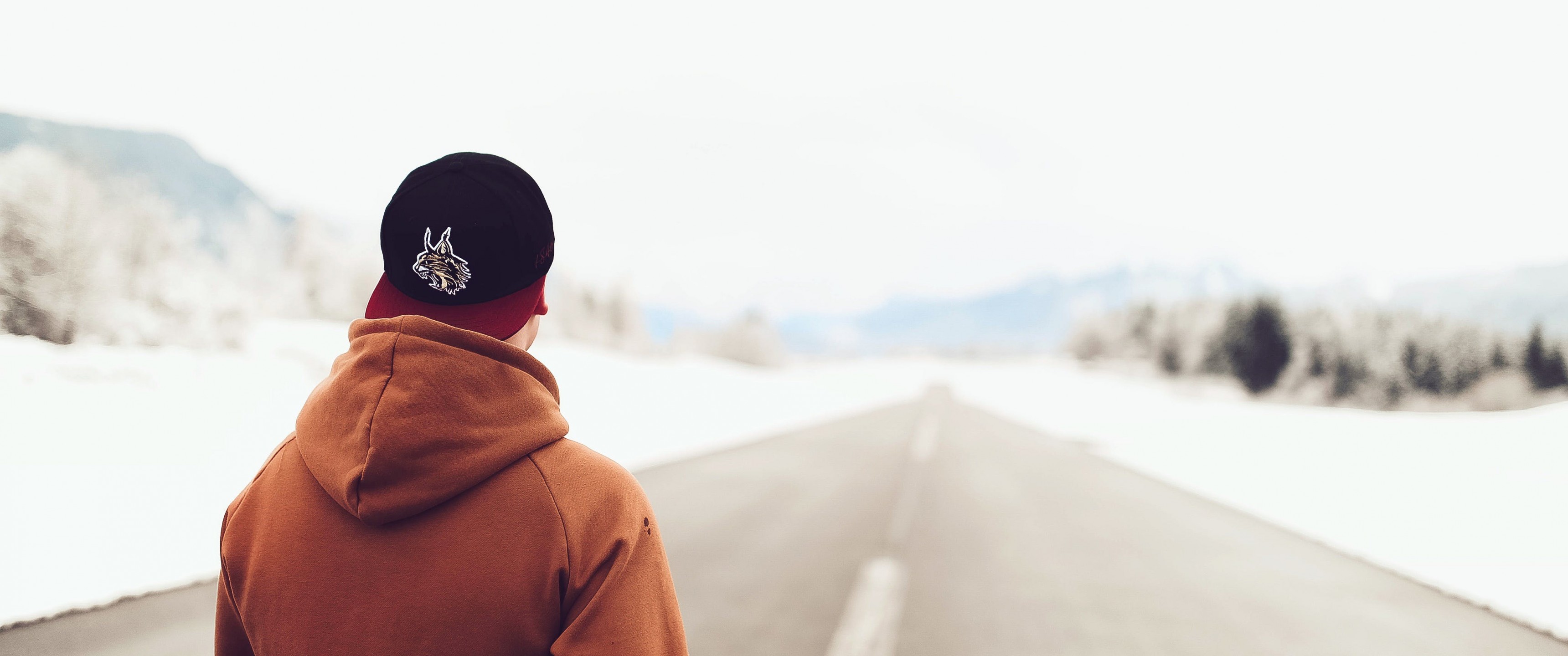 Person in Brown Hoodie Standing on Asphalt Road - 3440x1440 Ultra WQHD