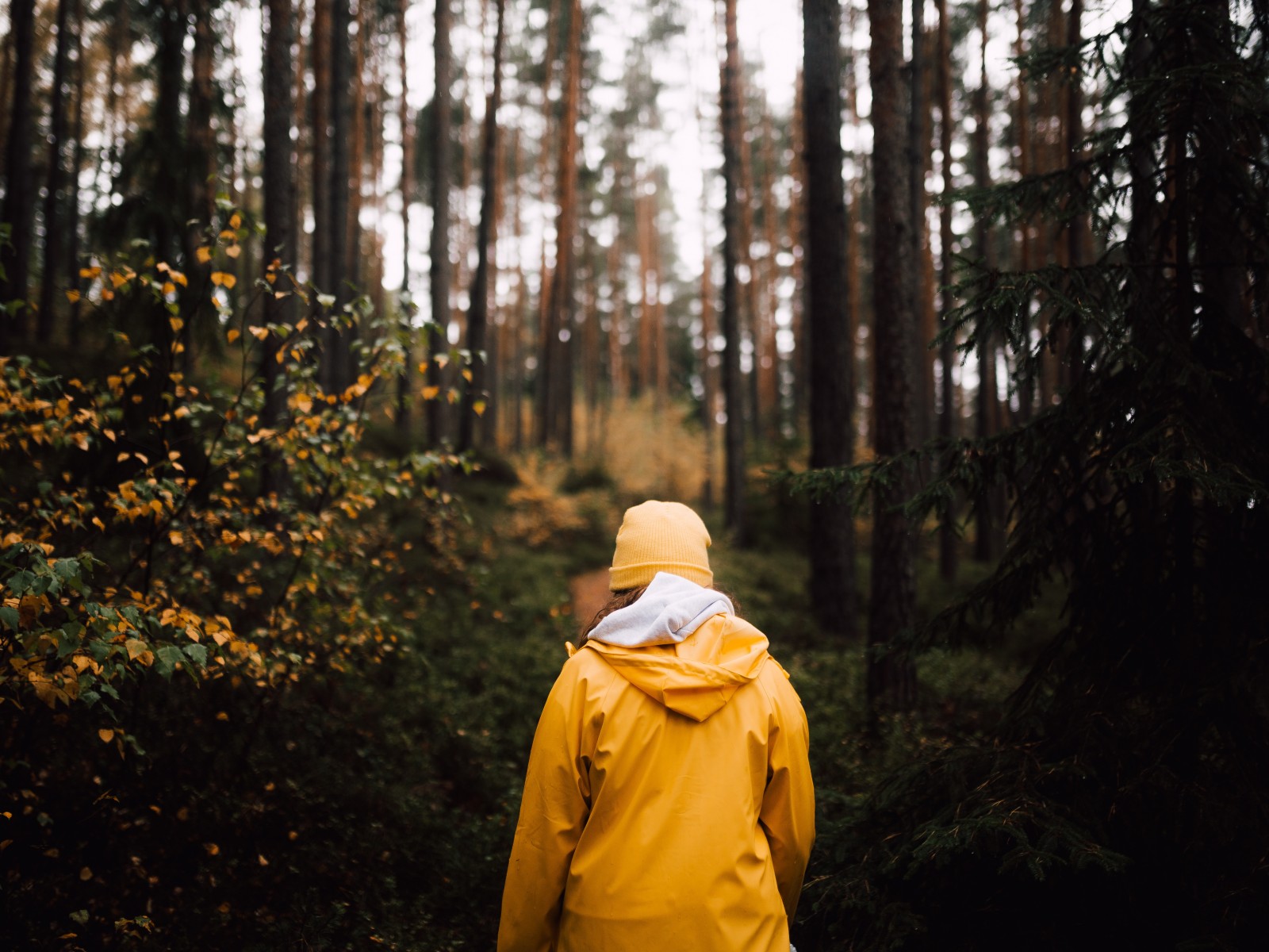 Person in Yellow Hoodie Standing in Forest - 1600x1200