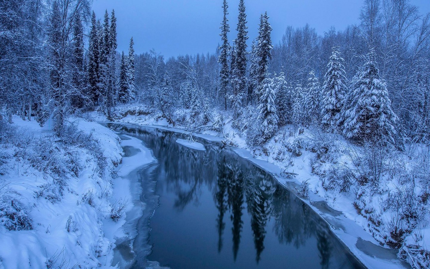 River Between Snow Covered Pine Trees - 1440x900