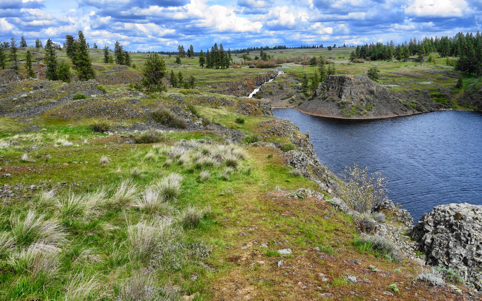 River in mountain valley and green grass - 1680x1050