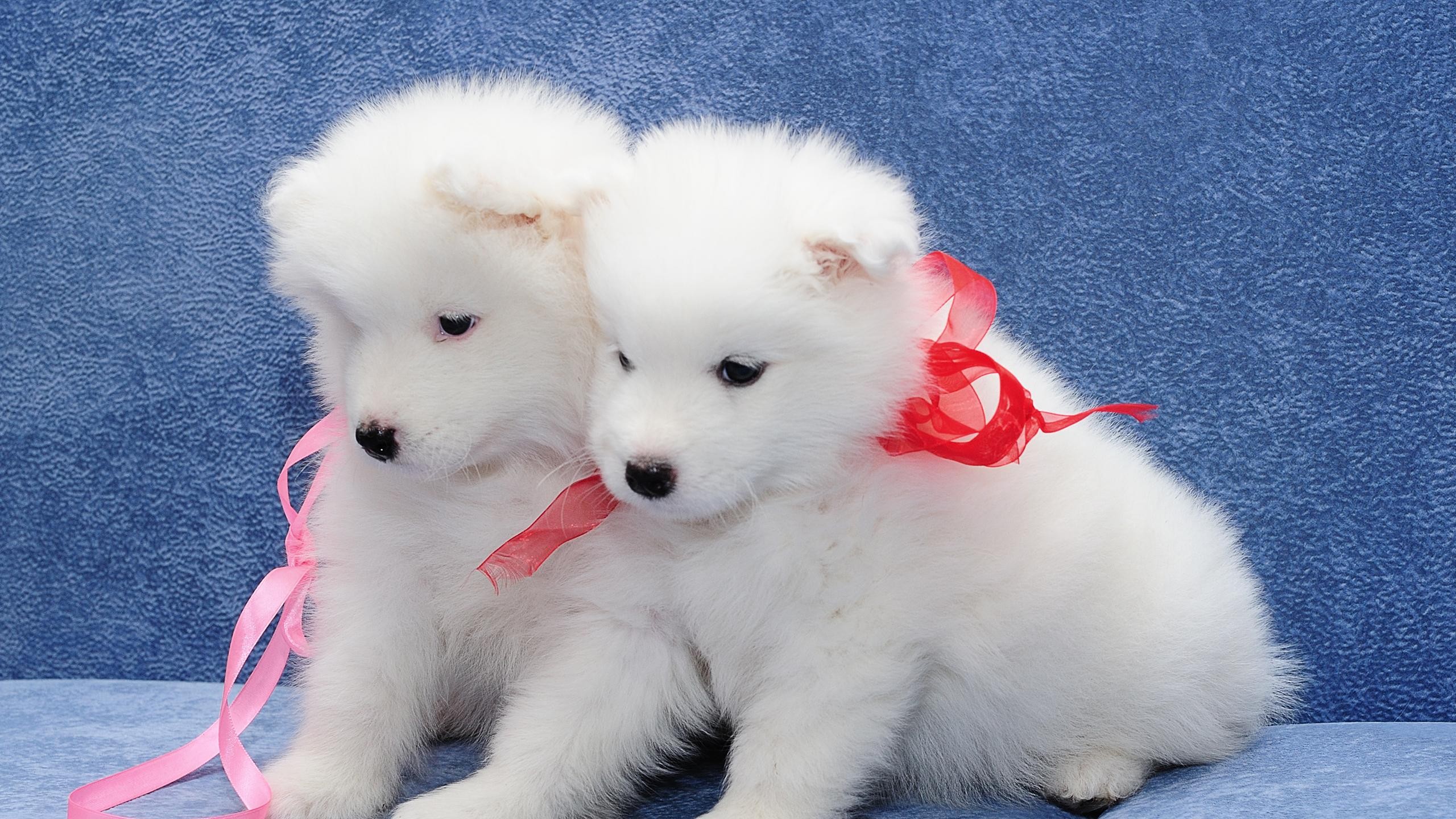 Samoyed Two White Puppies are on Blue Couch - 2560x1440
