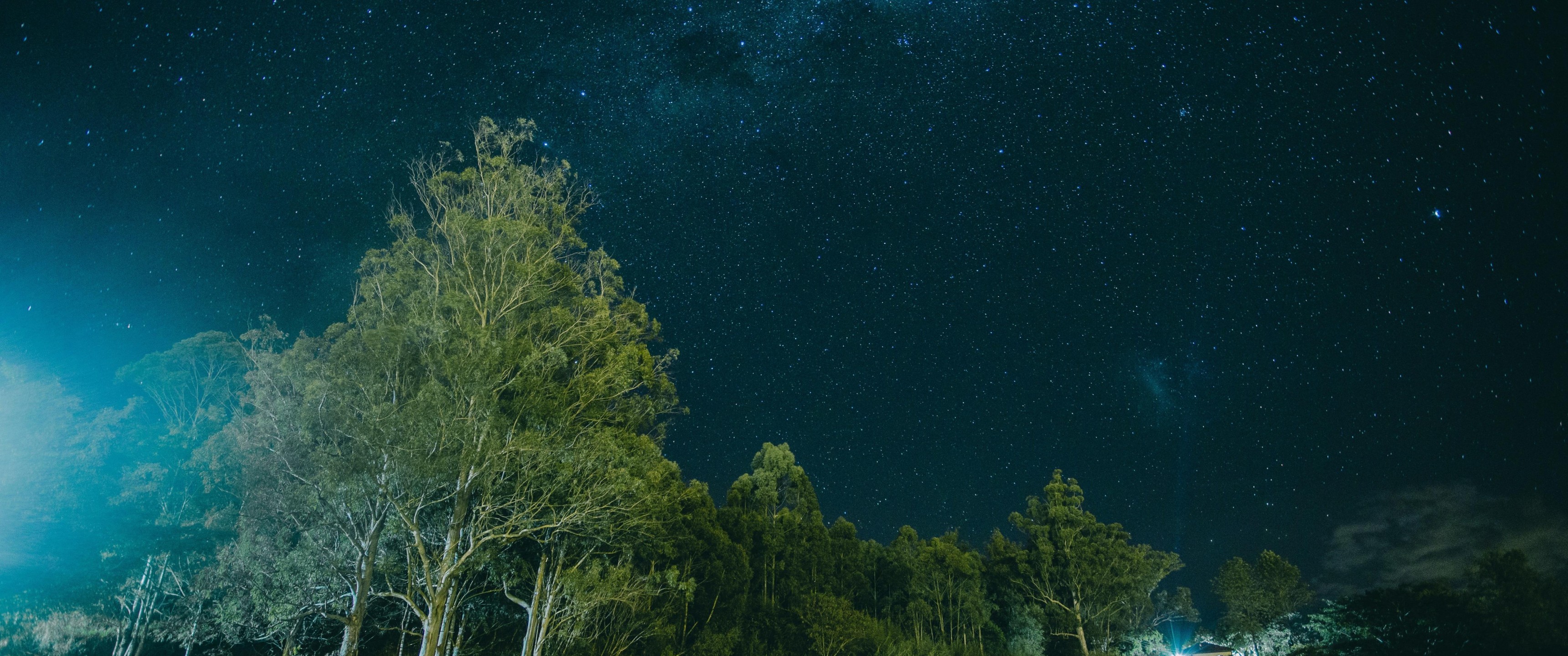 Starry Night Sky and Old Green Forest with House - 3440x1440 Ultra WQHD