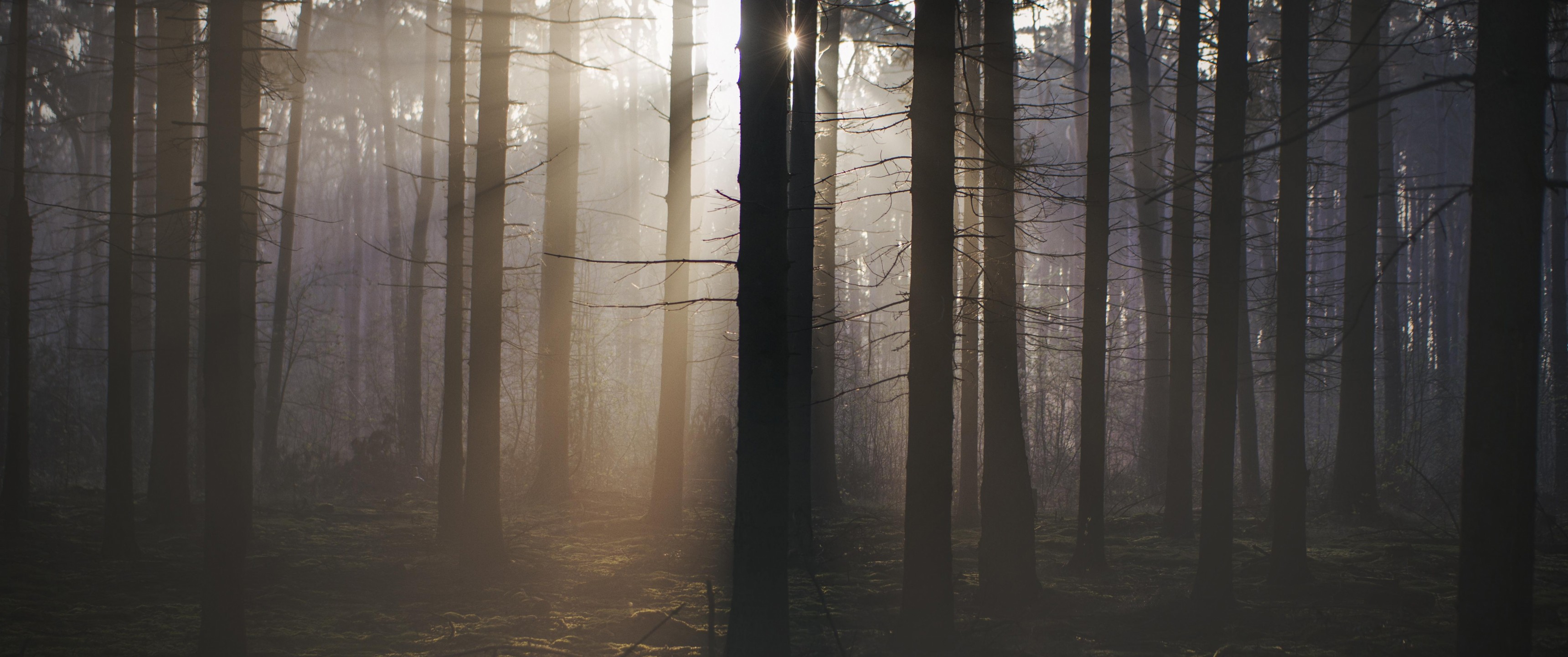 Sunlight from trees in dark forest - 3440x1440 Ultra WQHD