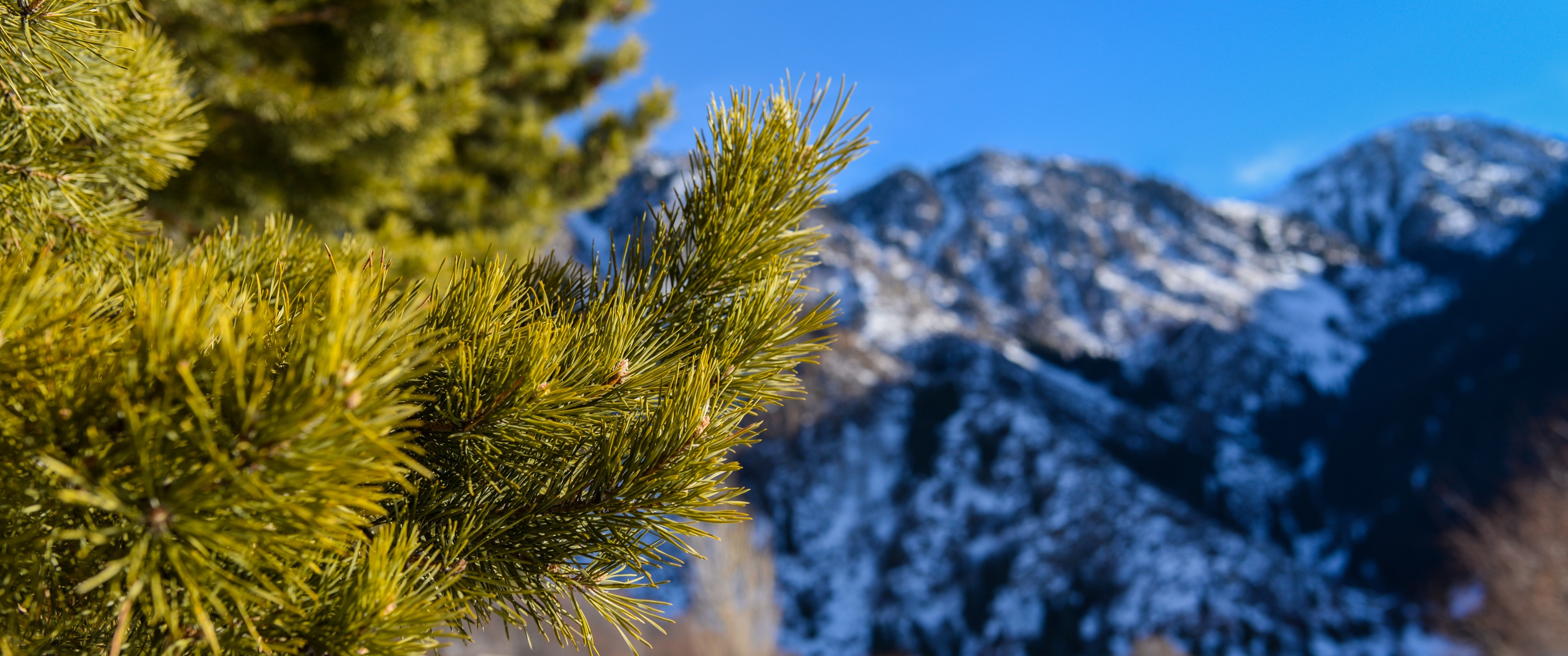 Tree Pins Closeup with Background Mountain - 3440x1440 Ultra WQHD