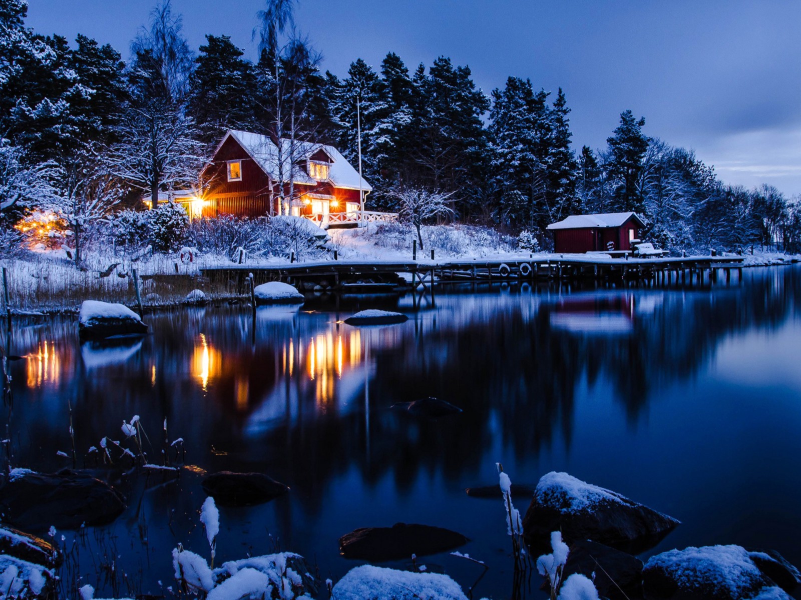 Winter Holiday Night at the Cottage in Mountain Valley - 1600x1200