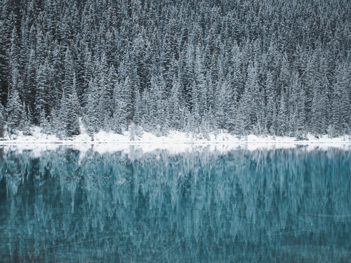Winter Snowed Forest and Pure Mirror on Lake - 1400x1050