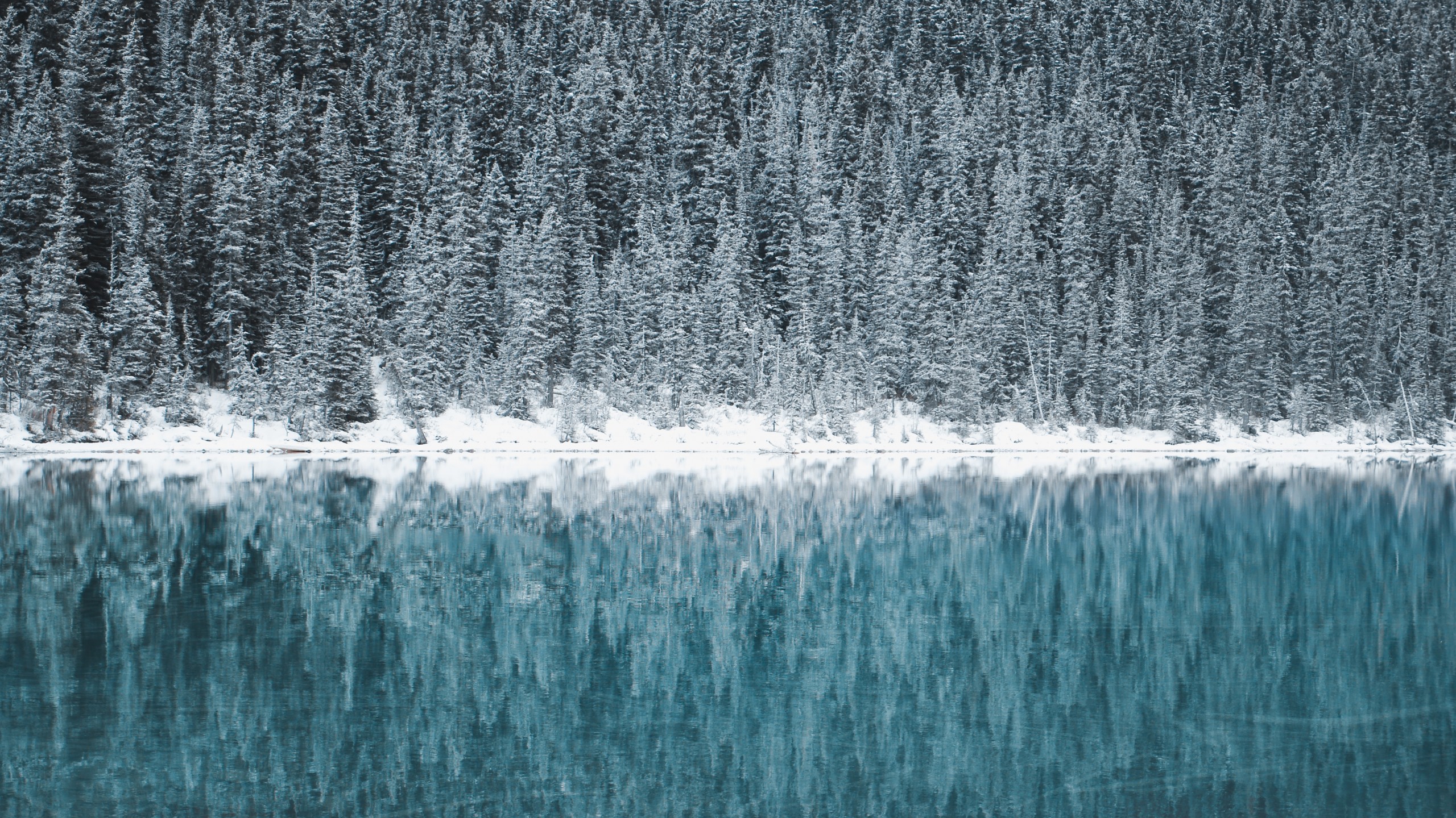 Winter Snowed Forest and Pure Mirror on Lake - 2560x1440