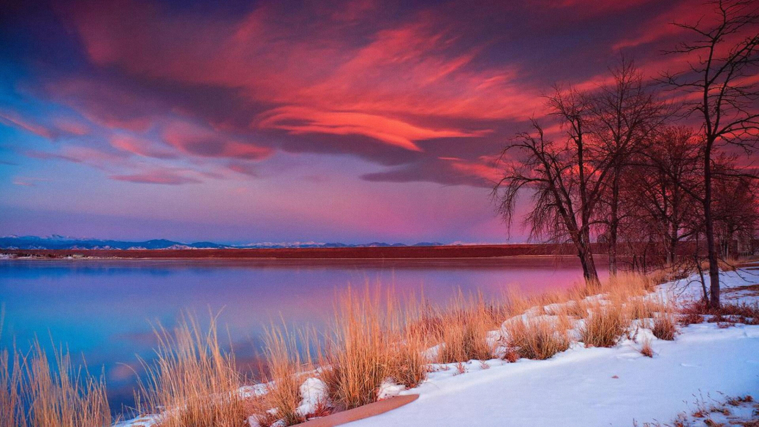 Wonderful Purple Sunset and Lake with Snowed Forest - 2560x1440