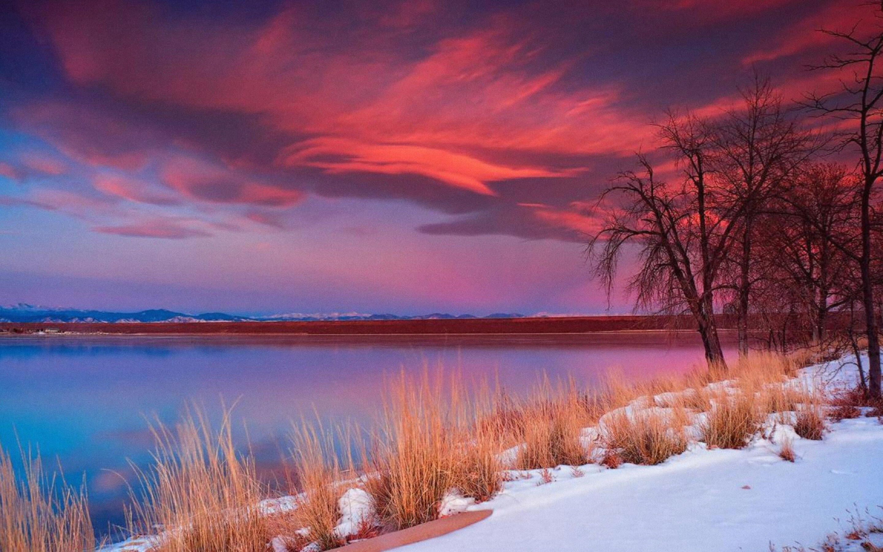 Wonderful Purple Sunset and Lake with Snowed Forest - 2880x1800