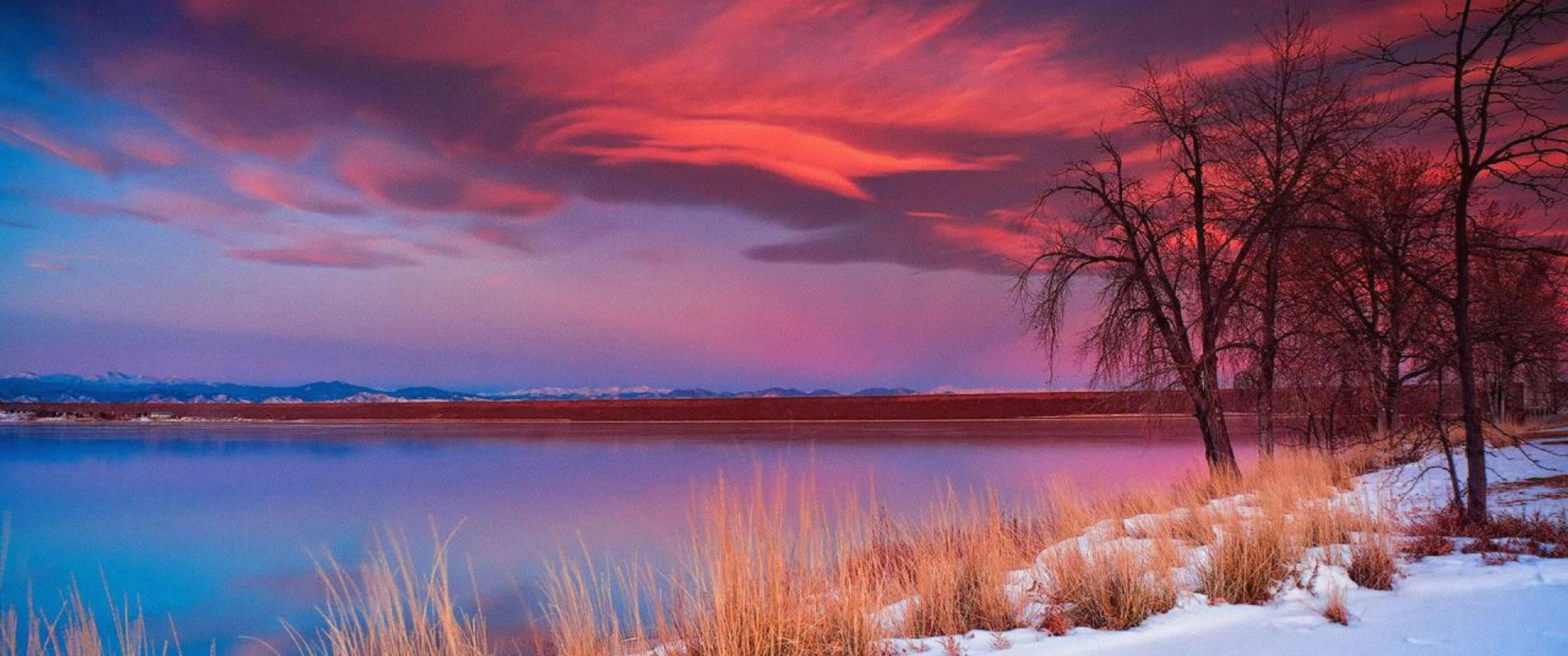 Wonderful Purple Sunset and Lake with Snowed Forest - 3440x1440 Ultra WQHD